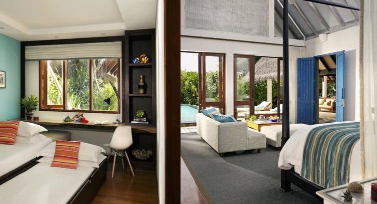 2 Two-bedroom Land and Ocean Suite (280 м², макс. 6 або 4+2 чол.). Унікальна вілла розташована на заході острова, частково над водою, частково на суші. Вітальня знаходиться у наземному павільйоні; дві спальні – у надводних павільйонах; великий приватний садок з шезлонгами, великий басейн (36 м²); відкритий павільйон; власна ділянка пляжу із душем на платформі. У наземному павільйоні – вітальня та їдальня на 6 осіб, кімната для батлера, бібліотека, яка може бути використана як гостьова кімната; повністю обладнана кухня (холодильник, плита, мікрохвильова піч, тостер, соковитискач, кавоварка, столовий посуд); 3 великі ванні кімнати з ванною і зливовим душем просто неба. Веранда з дерева тика з'єднує наземний і надводний павільйони. Прямий спуск на пляжі.
