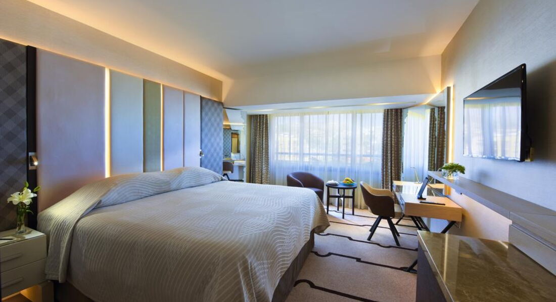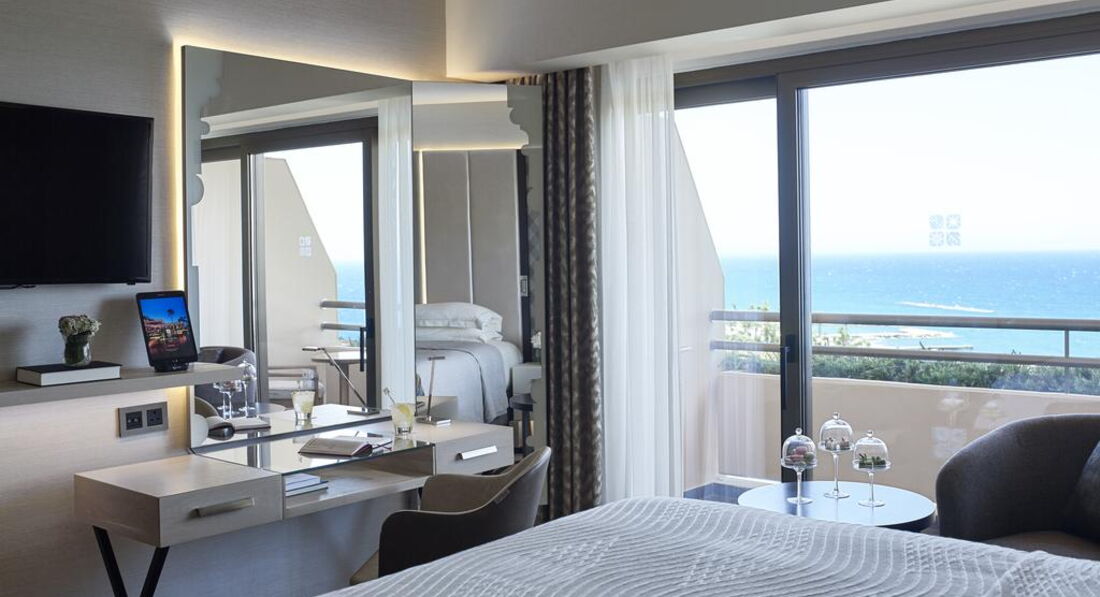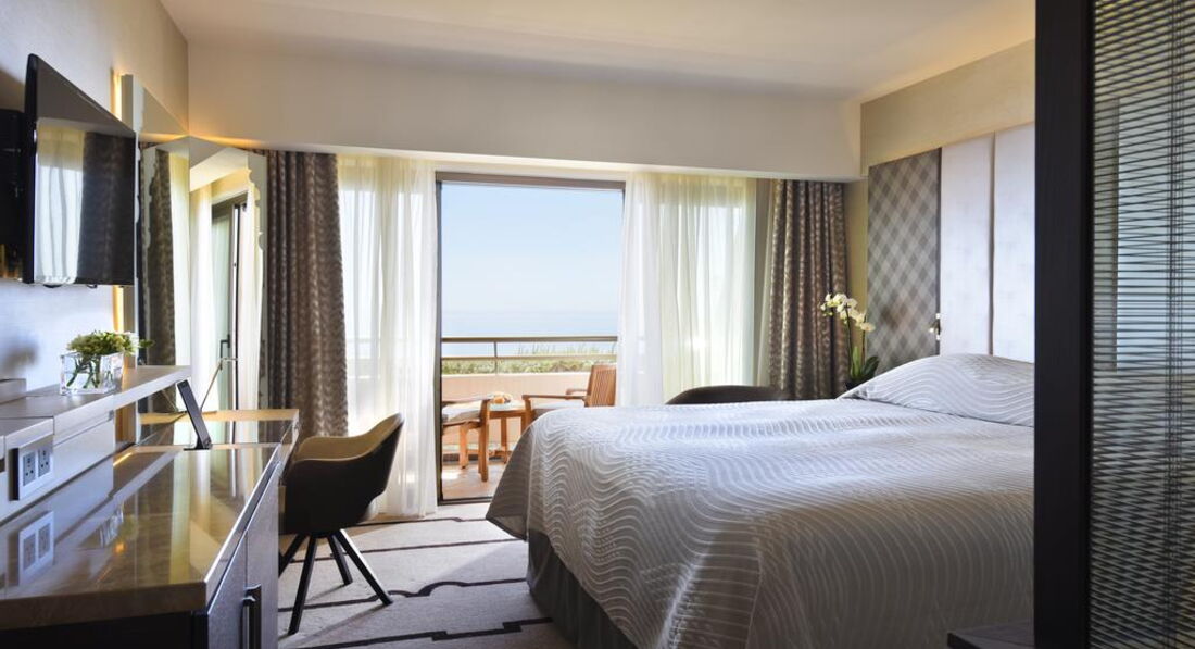 97 Superior Sea View (з 1 по 6 поверх головної будівлі, однокімнатний номер з видом на море, подвійна ванна джакузі, широке двоспальне ліжко або два окремі ліжка, балкон з двома стільцями та столиком, макс. 3 або 2+1 чол., 35 м2),