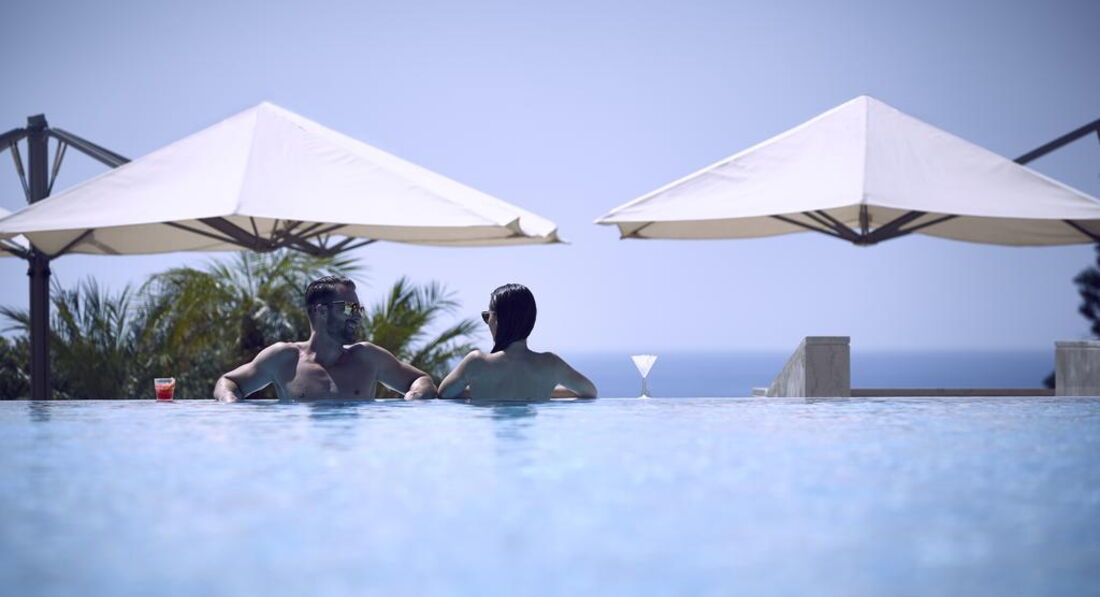 1 Executive Suites Sea View (Adult Only, номер тільки для дорослих, розташований на 1 поверсі головної будівлі; спальня з ліжком king-size, ванна кімната з великим кутовим джакузі, вбудованим душем і туалетом; вітальня, в якій знаходяться диван, кавовий столик, 2 крісла, стіл та стільці, балкон з видом на море, на якому розташований столик зі стільцями, 2 шезлонги та парасолька від сонця, макс.2 чол., 69 м2),