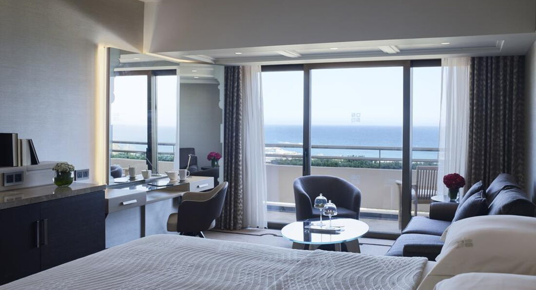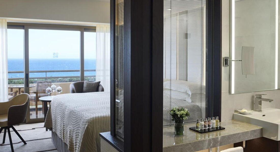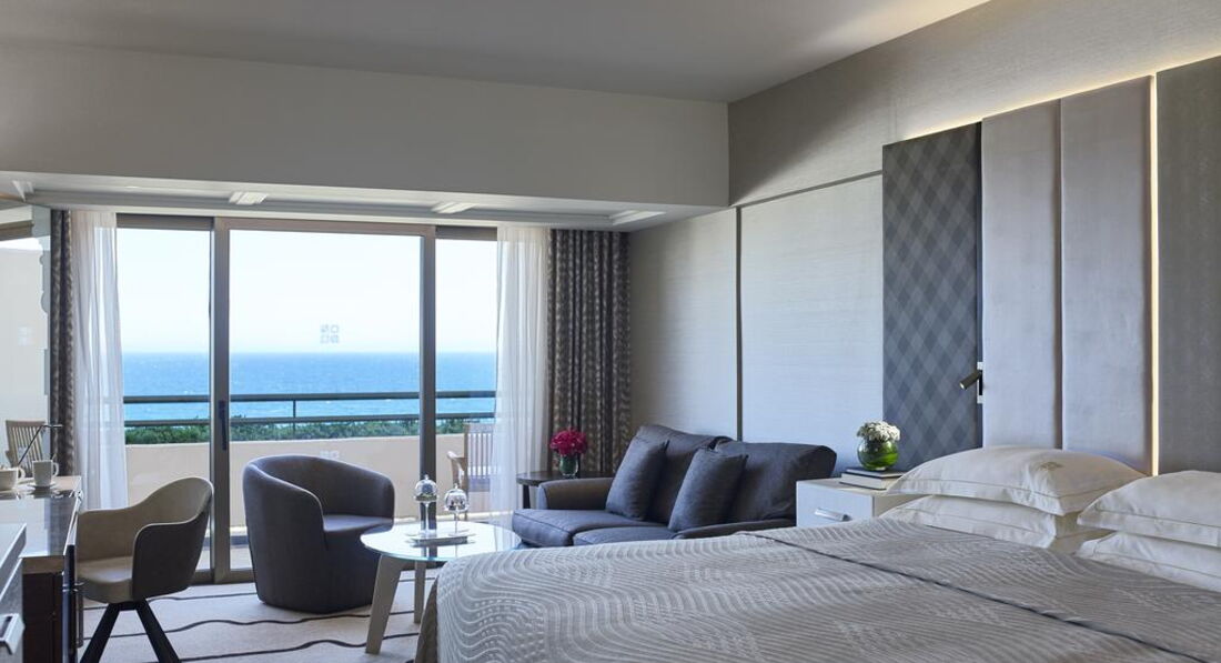 1 Prince Suite Sea View (Adult Only, номер тільки для дорослих, розташований у головній будівлі на 3 поверсі; вишукана спальня, вітальня, 2 ванні кімнати, гостьовий туалет, спальня з ліжком king-size, 2 маленькі шкіряні крісла, столик для кави; гардеробна, ванна кімната з джакузі, душова кабінка, туалет, біде, халати, капці, 3 балкони з дерев'яними стільцями та столиками, макс.2 чол., 80 м2),
