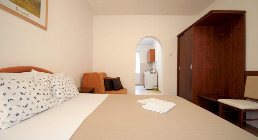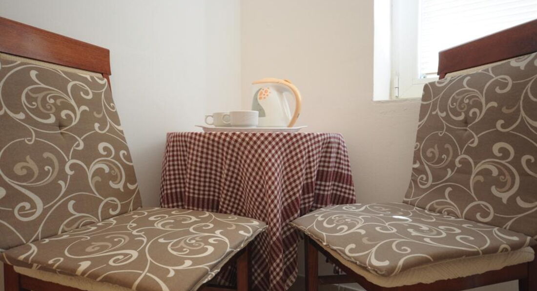 №1 DBL : 11м2 + тераса з видом на сад, французьке ліжко, кондиціонер, ТБ, Wi-Fi, праска, міні-холодильник, маленька чайна кухня (столові прилади, чашки, склянки, тарілки), ванна кімната з душем, фен.