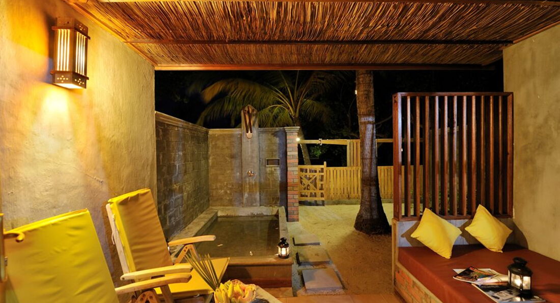Разместили нас быстро и хорошо. Здесь нет практики селить вновь прибывших в худшие комнаты, а потом переселять по просьбам трудящихся в комнаты получше, тут уже и чаевые сами собой напрашиваются. Пока китайцы с итальянцами заполняли свои анкеты, я просто подошел к местным, и попросил хорошую комнату на западной стороне (без ветра). Местные моей просьбе как будто обрадовались, и уже через 5 минут мы двигались в форватере темнокожей женщины, рассматривая ее аппетитные формы. Наша комната располагалась в 1-м блоке от рецепшн, в комнате было всё, что нужно человеку для счастья - душ с горячей водой, кондиционер (слабенький, но справлялся кое как), кровать с довольно жестким матрасом, 2 плетеных кресла с подушками, чайник, 2 бутылочки воды бесплатно, на балконе кран для мойки ног, 2 деревянных шезлонга и 2 матраса с номером комнаты на лежаки. К матрасам лежаки не прилагались, их надо было выискивать по кустам и занимать, путем накладывания на них матраса с номером комнаты. Сейф на рецепшн - бесплатно, фен в комнату - 2 доллара в день. Плюсы размещения закончились в 9 вечера, когда в баре врубили музыку. Гремело качественно и на совесть, басы заставляли остров подпрыгивать, это при том, что в памятке для туристов было написано, что на острове надо вести себя тихо и не мешать другим отдыхающим. В 11 вечера я позвонил на рецепшн и попытался объяснить этим людям, что после перелета неплохо было бы поспать. Меня услышали, извинились, сказали ОК, и после этого музыка гремела еще пол часа, в 11.30 музыку сделали таки потише, но до 12 ночи музыка продолжала играть.