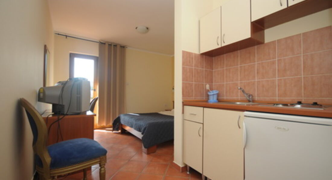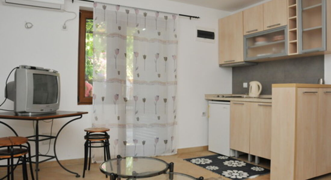 Двомісні-студіо, площею 20 м2 , є вітальнею з двоспальним ліжком і кухонним куточком, де є все необхідне для приготування їжі.