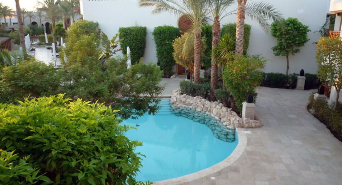 Не большой уютный отель,на второй линии.Выполненный в арабском стиле.Есть несколько номеров в виде гротов,с выходом в бассейн.По всей территории отеля идёт бассейн,с мостиками,лежаками по краям и с насыпным песчаным пляжем,с пологим заходом в воду.Пляж через дорогу,отеля Ghazala beach.Просторный песочный,есть не большой риф.Можно пользоваться ресторанами на территории 1 линии.
