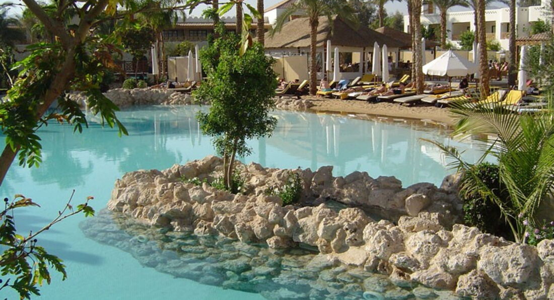 Архитектура отеля сделана в арабском стиле, много фонтанов в основном здании, интересные светильники, арки. Территория очень необычная, лабиринтообразная, вся в мостиках, подъемчиках, извилистый бассейн по всей территории, недалеко от итальянского ресторана на берегу бассейна лежит песок, создавая иллюзию пляжа. Выход из нескольких номером оформлен в виде террасы-грота, которые ведут прямо в бассейн. Как говорили в предыдущих отзывах, – египетская Венеция. И несмотря на кризис, персонала в отеле очень много, постоянно убирают, поливают, стригут. И как мне показалось, персонал более сдержанный, чем в других отелях, более вежливый.