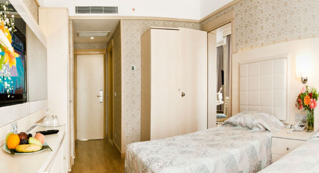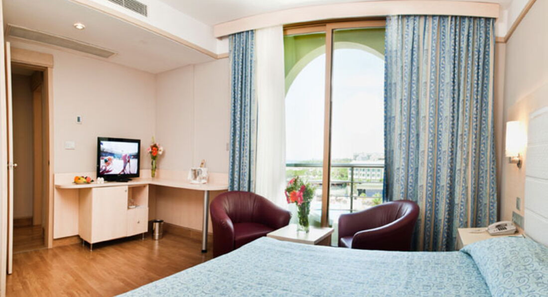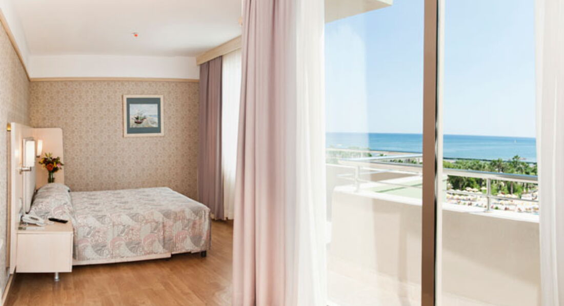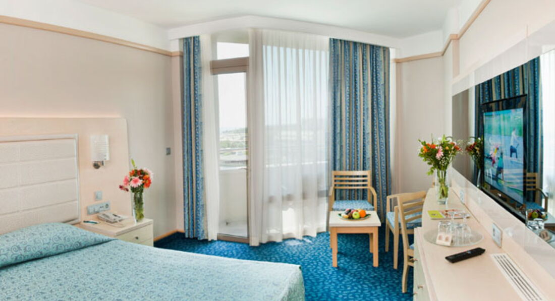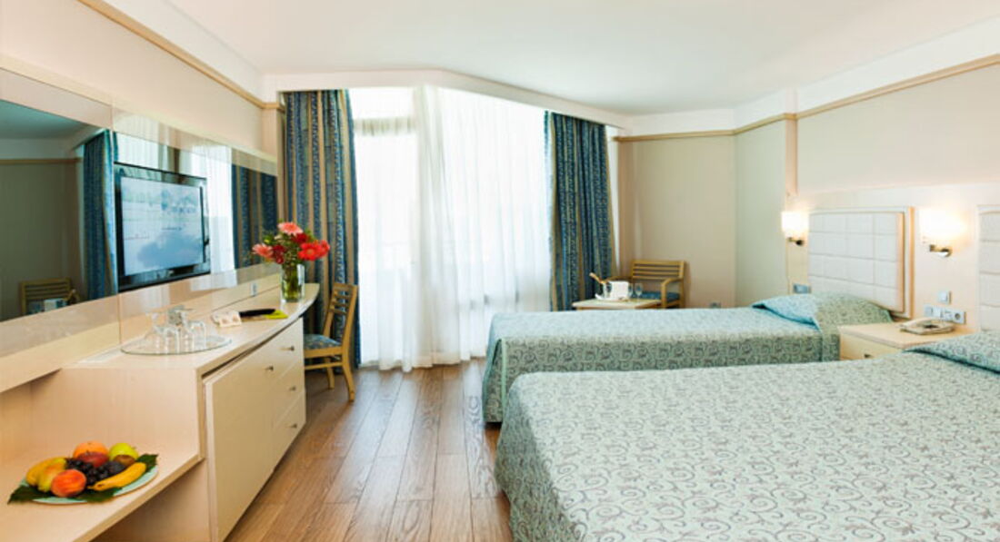 Приехали в отель часов в 7-00 утра, нас отправили на завтрак и сказали приходить к 8-30, потом в 9-30 нам выдали ключи от супер-пупер «хорошего» номера 1206 и мы уставшие отправились в него. Сам номер двухкомнатный, чистенько, светло, две комнатушки (общая площадь 42 м2) и выйдя на мини балкон 2-го этажа я увидела стеклянную зеленую стену отеля и просмотр чуток на дорогу (подъезд к отелю) и аквапарк. Заявив семье, что такой вид в течении 15 дней я созерцать не планировала, отправилась на рецепшен. Выслушав мои пожелания о проживание на 4-6 этажах с видом на море, было заявлено, что у вас ваучер без определенного вида (Анекс не предлагает выбора) и за вид на море доплата 10 евро/сутки, я по возмущалась, но почти согласилась, как оказалось, что свободных номеров на данный момент с видом на море нет. После моего категорического отказа проживать с видом на стенку, прибежал какой то дядечка и предложил «только для меня» сьют (62 м2) на 6-ом ( 7-ом по факту) этаже с прямым видом на море за 15 евро/сутки, по прайсу доплата от фемили В до сьюта по их словам 23 евро/сутки. Я с радостью согласилась, и после списания с банковской карты 13 т. рублей, о чем я потом ни разу не пожалела, любуясь видами с балкона, мы перебрались в свой новый номер.