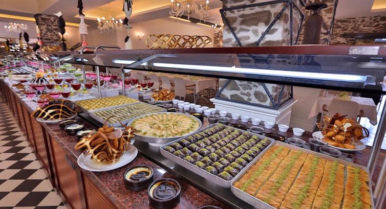 Ресторан - отдельная история. Кормят просто "на убой"! Чего там только нет! Еда на самый требовательный и изысканный вкус. Тематические вечера. Какая была шикарная "Турецкая ночь"! Это были не блюда национальной кухни, а произведения искусства. Все туристы, прежде чем поесть, фотографировали в ресторане эти шедевры. Главное во всей этой истории - не сильно прибавить в весе. Но соблазн слишком велик! Одна пахлава чего стоит! Единственное чего не умеют варить их повара, так это каши. Они старались. Каждый день новые каши варили. Но постоянно жесткая недоваренная крупа. Это были не каши, а скорее молочные супчики с недоваренным, хрустящим рисом. (Исключение составляла только манная каша). Но не беда. Там помимо каш столько всего! А каши можно и дома поесть.
