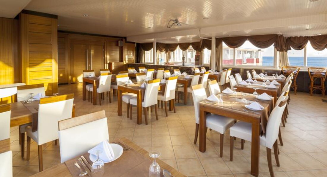 Ресторан: Без комментариев. Напоминает столовую для беженцев. Много столов, все вплотную, пол липкий, все грязное. Кондиционеры еле живые. Тарелки вообще смешные - одни блюдца почти. Салфетки клали то одной стороной, то другой (видимо, чтобы не стирать подольше), постоянно не было то соли, то салфеток, поэтому все брали друг у друга. Зубочисток вообще нет. Идти нужно в числе первых, потому что уже через полчаса многое заканчивается, а выносить не торопятся. То кофе закончится, то масло, то еще что-то. Официанты неопрятные, чуть ли не вырывают из рук посуду. В ресторане есть ширмочка прямо посреди зала, за ней тележка и на тележке - кучи грязной посуды. Там постоянно такой грохот, что мы даже сидя за одним столом друг друга еле слышала. Мало того, что этими грязными тарелками гремят, так еще и возят их по всему залу - ужасное зрелище (а на нижней полке этой тележке остатки еды). Много раз видела, как официанты прямо в своей форме с улицы катили какие-то бочки, бегали с грязными тряпками. Почему-то номер во время отъезда проверял официант, а один-единственный аниматор, который получил от кого-то в глаз и ходил с огромным фингалом, в своей футболке и шортах помогал официантам. Впервые вижу такое. Кошмар.