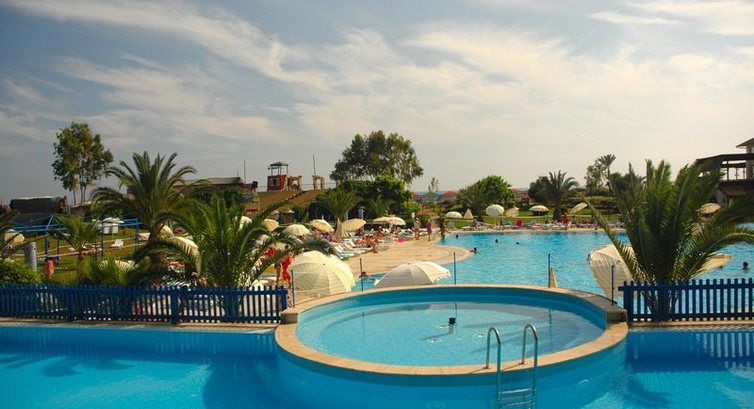 Летали с парнем потусить. Ну вот и потусили в нем. Вечный грохот, пьяная молодеж, плавающие лежаки в басеке.И я свосем не привераю, мы много где побывали и есть с чем сравнить. Кормили с лихвой,но все равно нашему брату мало и он преться опять и опять....отэтого очереди. Алко льют рекой, вот сколько поместиться в руках столько и нальют)))молодцы за это плюс, не жалеют. Отличный хамам(бесплатный) горки не плохие, но старые и вечно работало только две из трех. В номере сложно сказать что не работало....работал только телек, но мы его не смотрели. Остальное все было сломано)))ни фен, ни краны, ни даже замок на балконе ниче не работало))))А нам было пофиг...мы не просили чинить и не просили менять номер.Другие вроде ходили и им меняли без проблем и доплат. Вообщем, я как работник туриндустрии отель советую исключительно молодым и бесшабашным. Ибо с детьми там будет шумно и КСТАТИ!!!! Вообще нет моря!!! Учтите, купаться там невозможно!!!! Огромные плиты, скользкие и уходящие в море. Мы так и проторчали все 11 дней в басеках и хамаме. Нормальный такой муравейник, шумный но веселый.