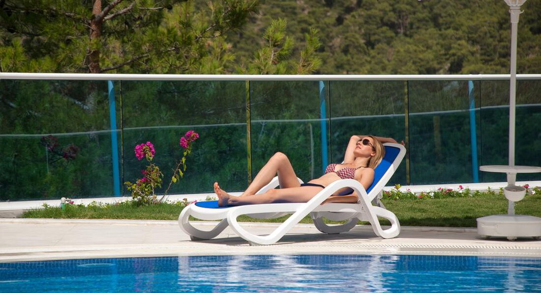 Необходимо приготовиться к тому, что это немного другой отдых, чем обычно славится Турция с прибрежными отелями. Тут море далеко и далеко не по прямой и к тому же в гору. Это и плюс, и минус. Плюс в том, что отель на горе, рядом лес хвойный, очень чистый воздух, автодорог рядом нет (кроме подъездной дороги к отелю). Также там прохладнее, даже в самую жару, чем внизу, в Олюденизе. Минус в том, что пешком до пляжа не дойдешь, а трансферы неудобные (утром в 9 и 10 туда, и в 16.30 и 17.30 - обратно). К обеду никаких трансферов нет, так что питаться на пляже за свой счет. Возят на пляж GREEN PARK, это в лагуне. Сам пляж приятный, лежаки, зонтики - все есть. Еще есть тень от деревьев и приятная европейская музыка. Передевалки, души все нормально. Море там мелкое и реально чтобы поплавать надо вбок и вперед плыть. Это мне не очень понравилось, но все же терпимо. Зато детишкам тепло, т.к. мелководье прогревается быстрее. Кстати, на пляже можно взять катамаранчик и покататься по лагуне.