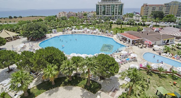 Начну с того, что отель не тянет на твердые 5 звезд, но мне лично он понравился, большая территория, бассейн большой и детский и взрослый, детская площадка и там же небольшая детская комната, где малыши вместе с родителями могут порисовать, пособирать конструктор и т.д. Хороший, приветливый персонал, номер мне тоже понравился, хорошее питание, взрослый точно голодный не останется, дети в принципе тоже, на завтрак по мимо накрытия в ресторане на улице жарят омлет, оладушки и лаваш, на ужин там же жарят овощи, мясо, рыбу или куру на гриле, каждый день был арбуз, периодически давали клубнику и дыню, всегда были яблоки, апельсины, груши, сладости, овощи и зелень, ресторан большой, официанты как пчелки бегают убирают сразу всю грязную посуду, протирают столы и заменяют скатерти если испачкались, целый день в отеле анимация, каждый вечер мини диско для детей и потом шоу тайм для взрослых, после 11 вечера тишина и покой, хотя при отеле есть клуб, но он не всегда открыт, зависит от количества народу там. Отель хорошо подходит для отдыха с детьми, тем кто хочет тусоваться ночами наверно там будет скучно. У отеля нет собственного пляжа, но если выйти из отеля направо и не много пройти есть отличный песчаный городской пляж, чистое море, прозрачная вода и светлый теплый песочек, не сразу глубоко, что отлично для детей, есть еще пляж с другой стороны, если выйти налево из отеля, но там камни и заход с пирса, этот пляж относиться к отелю и хоть и идти до него пять минут, туда каждый день есть утром трансфер из отеля, на пирсе для проживающих бесплатно лежаки и небольшой бар, где можно съесть сандвич или попить лимонад, воду, но мы на этот пляж не ходили потому что трехлетнему ребенку с пирса в море не зайти, поэтому ходили на другой