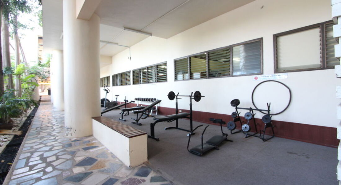 Спортзал: на улице, гантельки, штанги по минимуму и все вымученное.