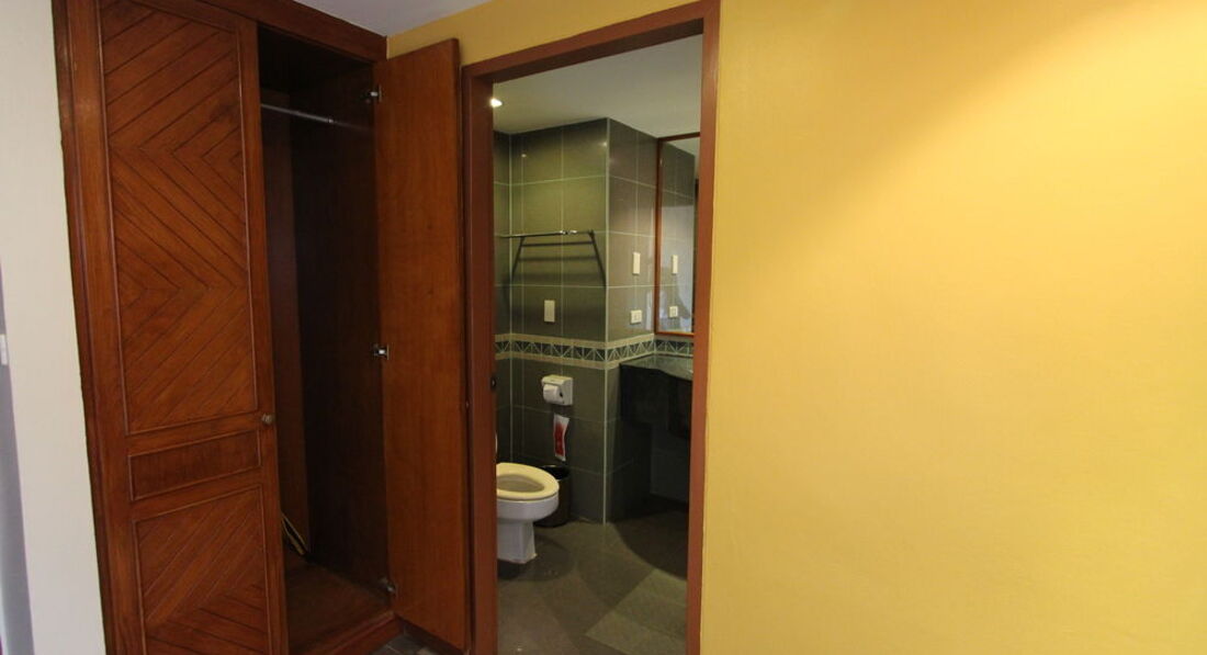 Номер на 3-м этаже. Мебель старая скрипучая и местами царапанная, пол обшарпанный, стены грязные, занавески потертые, сейфа нет. ТВ старый, каналов много, российских 3 да и то рябят. В шкафу б/у тапочки и 2 халата. Мебель как бы есть, но вещи положить некуда, так и хранилась основная часть вещей в чемодане. В минибаре 2 бутылки воды, на столе стаканы, ложки, чай кофе сахар на 2 персоны. В общем, придраться есть к чему, особенно в ванной, где стоит старый пожелтевший толчок и плесень везде, включая занавески душа. Есть фен.