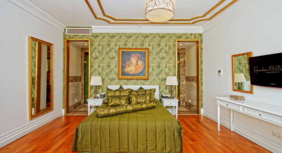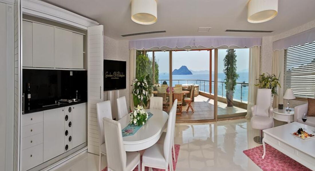 Отдыхали в отеле с 01 по 12 августа 2012 года, вдвоем с супругом, номер Venus villa тип А (с выходом к бассейну с морской водой, вид на горы и поселок, все остальные номера в отеле с видом на , ванна на втором этаже, заявленная как джакузи - это просто ванна с гидромассажем, в номере есть кухня с электроплитой и даже духовкой и посудомоечной машиной). Отель очень хороший, территория не большая, но все построено очень продумано и оригинально, ярусами. Единственное, что от самого Бодрума далековато, и поселок, где расположен отель конечно больше напоминает деревню))) При полной заполненности отеля, густонаселенность абсолютно не ощущается, всегда свободно и на пляже, и у общих бассейнов, а также в ресторане. В общем ресторане питание хорошее, официанты обслуживают быстро, всегда есть места, все засервировано, грязная посуда быстро убирается. Во время нашего отдыха работали турецкий и итальянский рестораны, меню вполне достойное, не знаю почему, но мы там три раза были и сидели вообще одни))))) Рум сервис тоже работает хорошо (за отдельную плату), меню скудновато, но если лень куда-то выходить, то покушать можно. В первый день отдыха посетили (как рекомендуется) турецкую баню в спа-центре отеля, сделали пиллинг, пенный массаж и балийский массаж, цены нормальные, спа-центр шикарный, все было очень здорово и приятно. Пляж не большой, но как я уже писала, мест всегда полно, вход в море нормальный, для детей очень хорошо мелко, взрослым лучше заходить с пирса, там хоть поглубже. Аннимация есть, но абсолютно не навязчивая, вечером каждый день какая-нибудь программа (наблюдали турецкую ночь, африканский цирк), или живая музыка, но все очень не шумно, не дискотечно. Живая музыка организована рядом с бассейном у бара, народ слушает, сидя в баре, или на диванчиках около музыкантов,все очень камерно и просто замечательно. Контингент отдыхающих - это в основном турки и азербайджанцы, россиян вообще не слышно и не видно))))) Отдыхом остались очень довольны, отдельное спасибо Ирине (русскоговорящей девушке, работающей на рецепшене), которая нам помогала по всем вопросам. Также спасибо отельному гиду от тезтура Марине и Светлане (гид по поездкам)! С учетом того, что мы отдыхали в таких отелях Турции, как Риксос Сангейт в Кемере, Калиста Люксери в Белеке, могу с полной уверенностью рекомендовать отель Gardens of Babylon, как вполне достойный и на своем уровне! Желаю всем приятного отдыха!