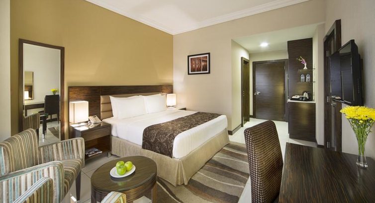 Номер - Deluxe с 1 двуспальной кроватью - небольшой, чистый, относительно новый, комната около 15 м, ванная-около 6 м, выложена плиткой. Шторы плотно зашторены, окна выходят во двор и на соседнее, близко расположенное здание. Но не за видом из окна приезжают в Дубай.