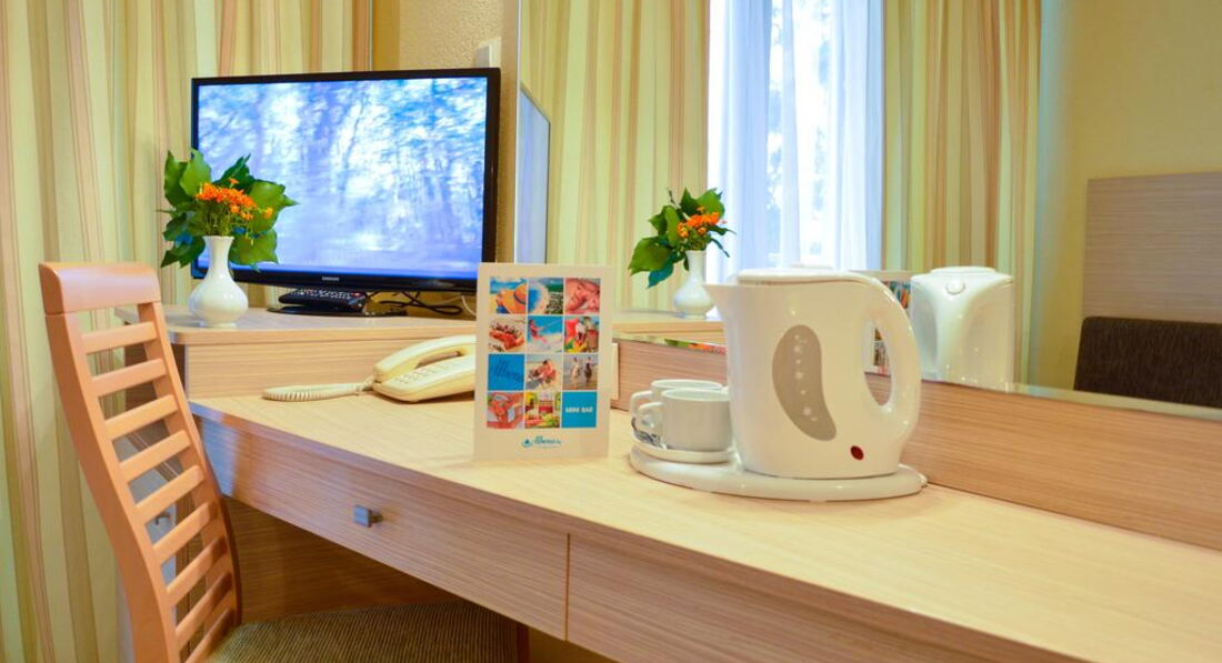 Номер (корпус В, вид на море)- замечательно! Большая комната с 2-мя полноценными кроватями, диванчиком, чайным столиком (в номере есть чайник и все необходимое), холодильником (бар за доп.плату) и плазмой. Удобная и просторная ванная комната.