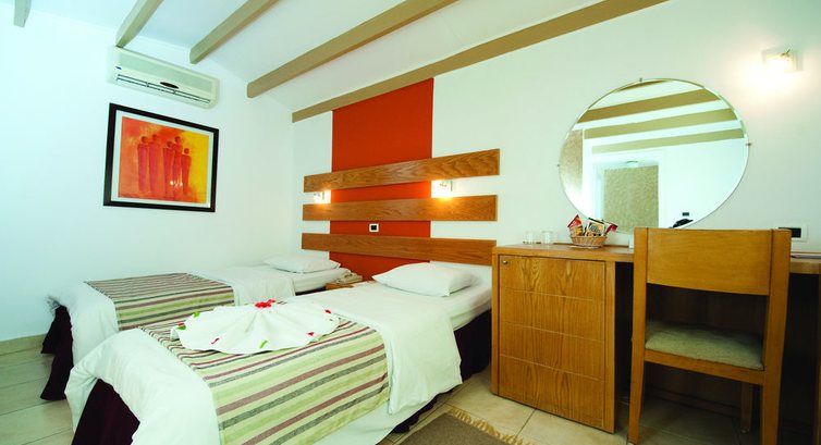 Итак, РАЗМЕЩЕНИЕ. Нам дали номер в основном корпусе, с 2-мя кроватями. На мои вопросы, где будет спать ребенок- ответили, не волнуйтесь, сейчас все сделаем. Через некоторое время принесли кровать - сломанную, она выглядела как детская горка, передние ножки были в два раза короче чем задние. Я в полном недоумении, а обслуживающий персонал, стоит довольный, улыбается, как-будто все замечательно. Просьба заменить кровать - вызвала массу неудовольствия. В день прилета несколько раз пришлось ходить на ресепшен и требовать то полотенце, то простыни, то даже туалетную бумагу. И каждый раз у персонала все это отражалось ненавистью на лице. Видимо хотели денег, но спрашивается за что? Очень неприятно. Итак, номер - убогий, мебель старая, выкрашенная мрачно-зеленой краской, сантехника течет, но самое страшное, что в первую же ночь нас буквально съели комары - на ребенке не было живого места. Пришлось на следующий день бежать в магазин и покупать фумитокс, даже не подумали с с собой привезти.