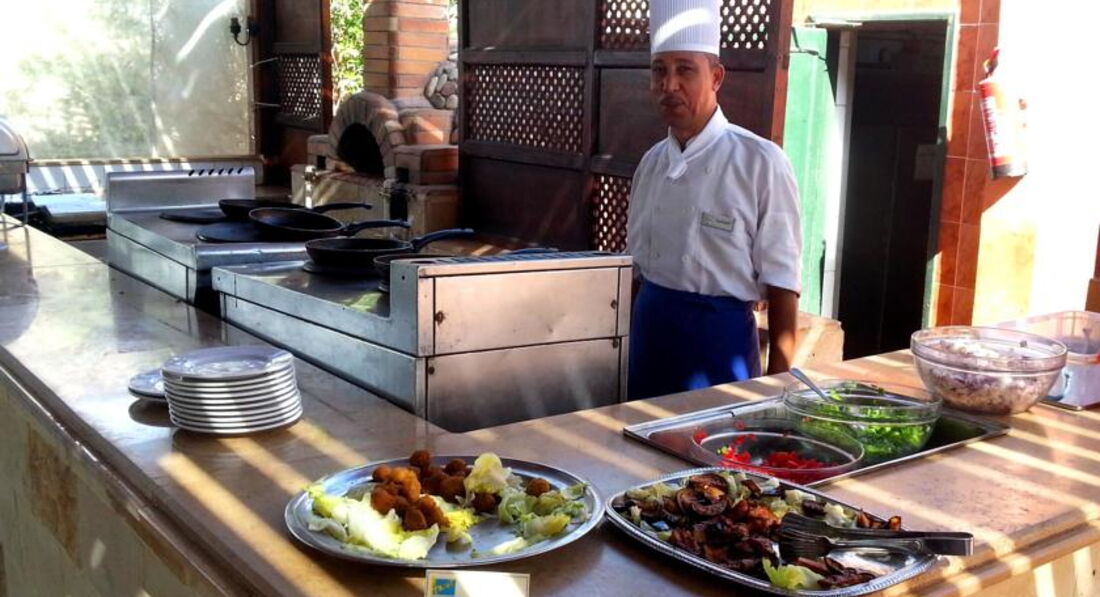 Оговорюсь сразу, все указано на мой вкус, а мне бы мяска, да рыбки… Завтрак обычен для египтов, в основном лакомился молочным супом с макаронными изделиями, блинами и вареным кофе. Обед на улице скромен, выручал один суп и гриль (мясо или рыба). Ужин супер – 3 супа и 2-3 гриля в двух ресторанах. Особенности питания: грили из мяса супер, но оно хорошо перченое (не каждый сможет, есть говядину, перепелок, баранину, утку), рыба есть, но несъедобная, овощи, выпечка, сладкое скромны (двух последних не пробовал), очень мало, для любителей, фруктов, т.е. всегда резанная и не сладкая дыня (но это не африканская, маленькая и с темной кожей) и вдобавок к ней, на обед и ужин что – то одно (два раза понравились груши, остальное не для меня). Из напитков понравились пакетированные соки (только в лобби) и ром (попробовал и др., но пиво, разливное, самое невкусное, что пил). Общая оценка по разделу 4,00.