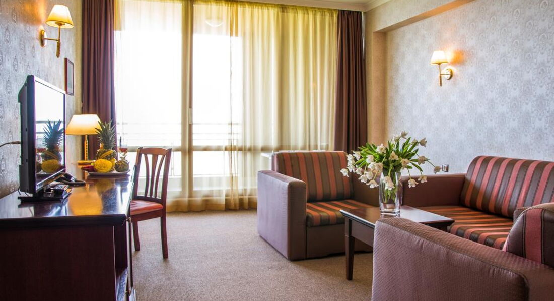 Обстановка номера нормальная - мебель пока еще новая, не попорченная, ковролин в комнате новый, приятный. Плитка в прихожей тоже хорошая. Все относительно чисто, если не обращать внимание на пятна на стенах и ночниках. Но....меня поразило, что в отеле категории 4* нет полотенца для ног, шапочек для душа, тапочек. Интересно, как в Болгарии получают звездность - ведь должны же соблюдаться элементарные стандарты категорийности. Сама работаю в отельном бизнесе 10 лет и знаю, что очень сложно получить категорию.