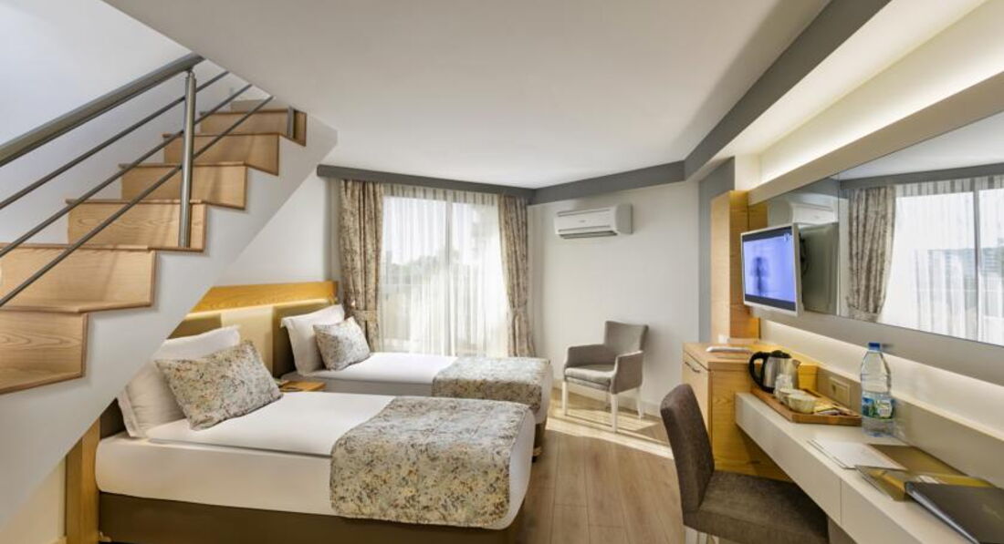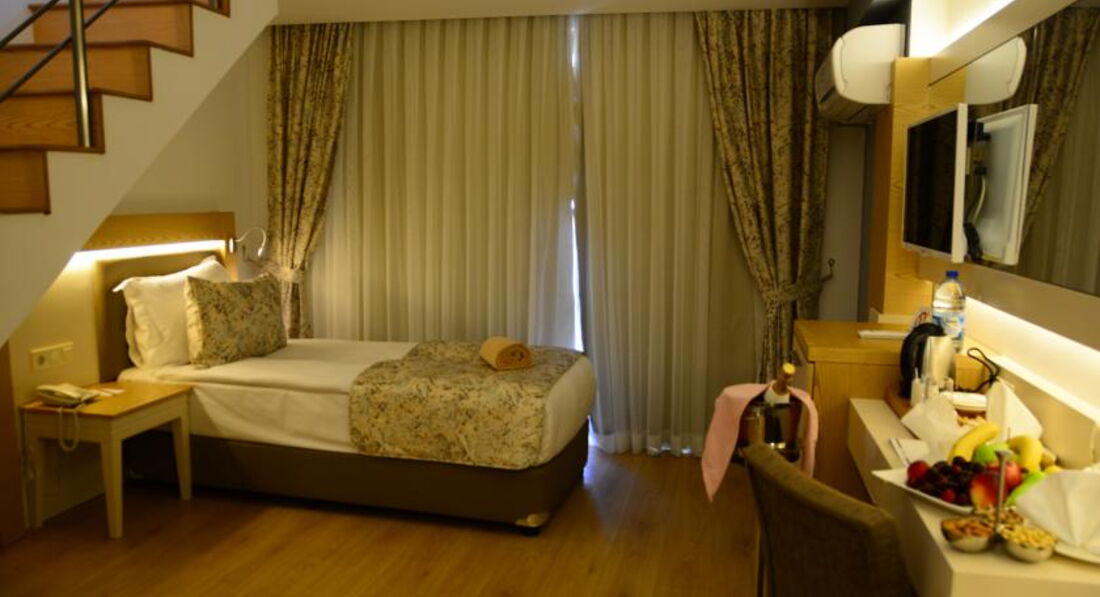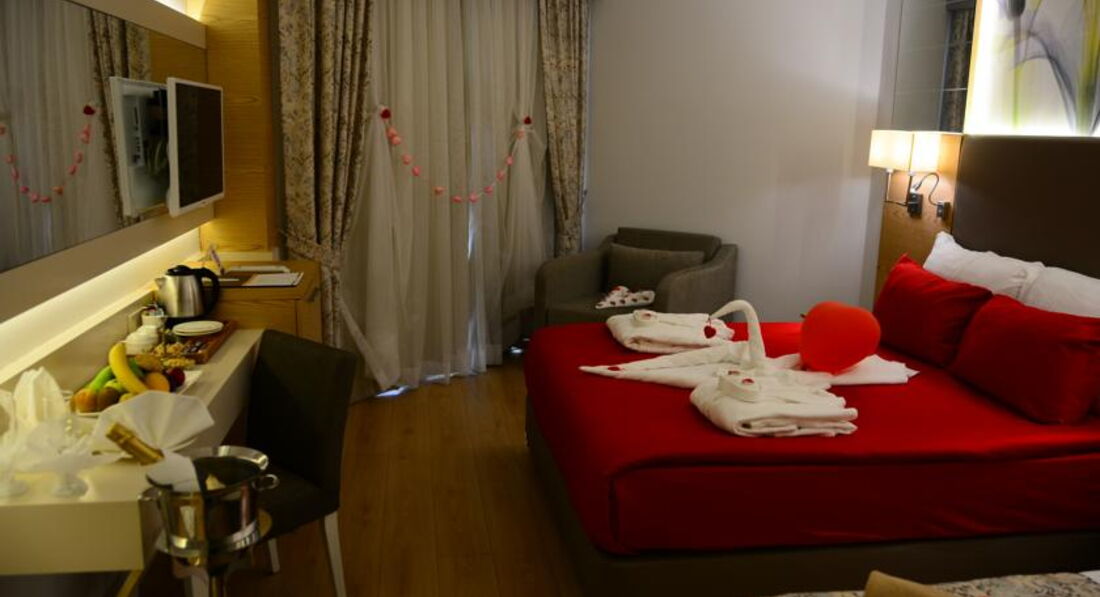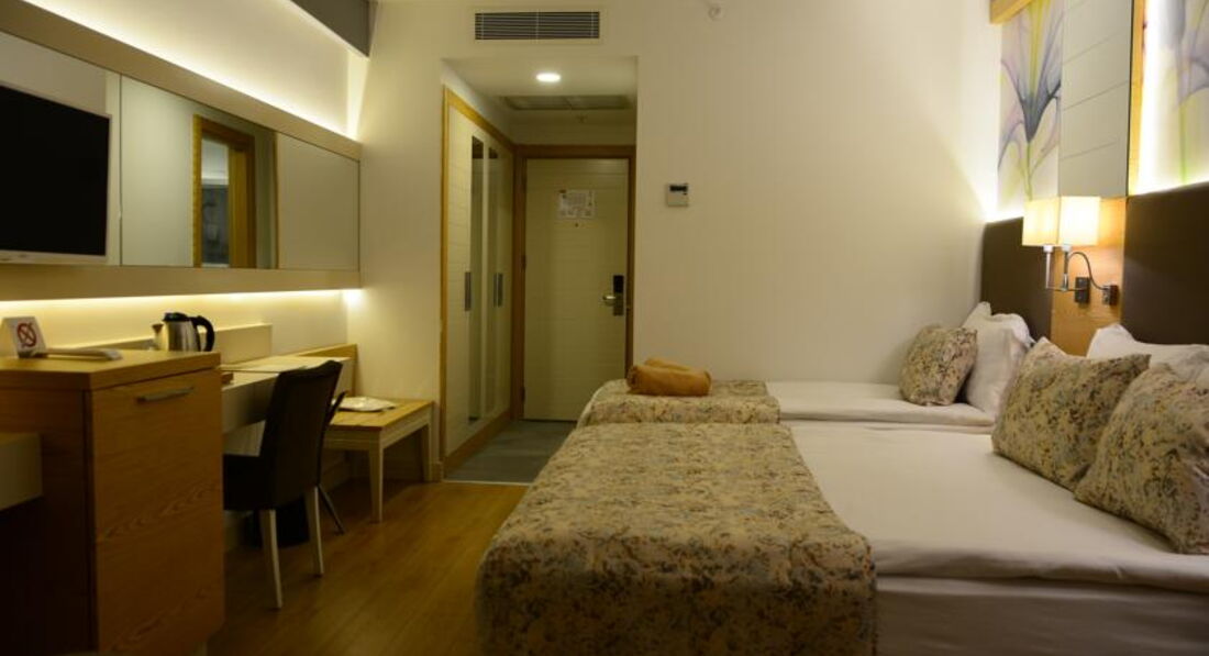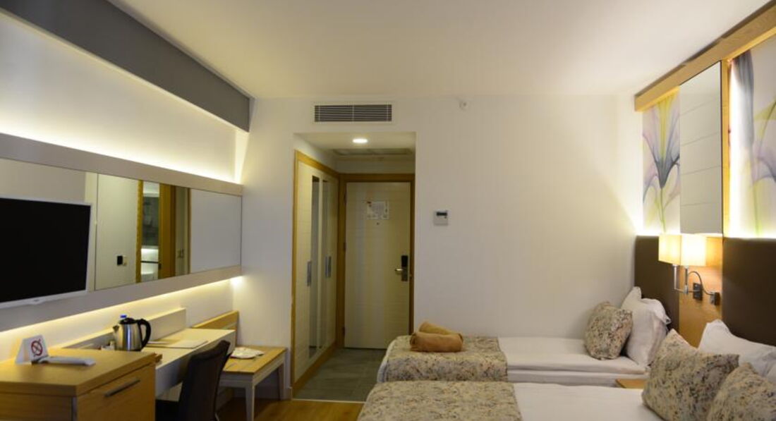 Отдыхали в этом отеле две недели. Приехали в отель вечером, сказали что мест нет, ночевали в другом отеле. Заселили, основательно подпортив настроение, только после 10 часов, на следующий день. Номер очень странный, детская кровать стоит в коридоре, напротив туалета, там же дверь в какое то техническое помещение (думаю что там вентиляционная шахта, так как там что то периодически гудело). В номере все работало исправно, но для душа только жидкое мыло в дозаторе. В отеле отдыхают в основном немцы ( пенсионеры), немного украинцев турок и русских. Русских там явно игнорируют. В ресторане название блюда только на турецком, английском и конечно немецком. Персонал в отеле на русском не говорит. Детского стола нет, все очень острое, ребенок две недели питался только картошкой фри и макаронами. Мороженного нет. Сок только порошковый. Молочных коктелей нет.Пахлава только в пятницу.Фруктов мало. Детская комната без окон, в полуподвальном помещении, не проветривается, зато хорошо работает кондиционер и наш ребенок заболел. Детям скучно, да их там и немного. Отель понравится пенсионерам для тихого, спокойного отдыха. Мы сюда не вернемся.