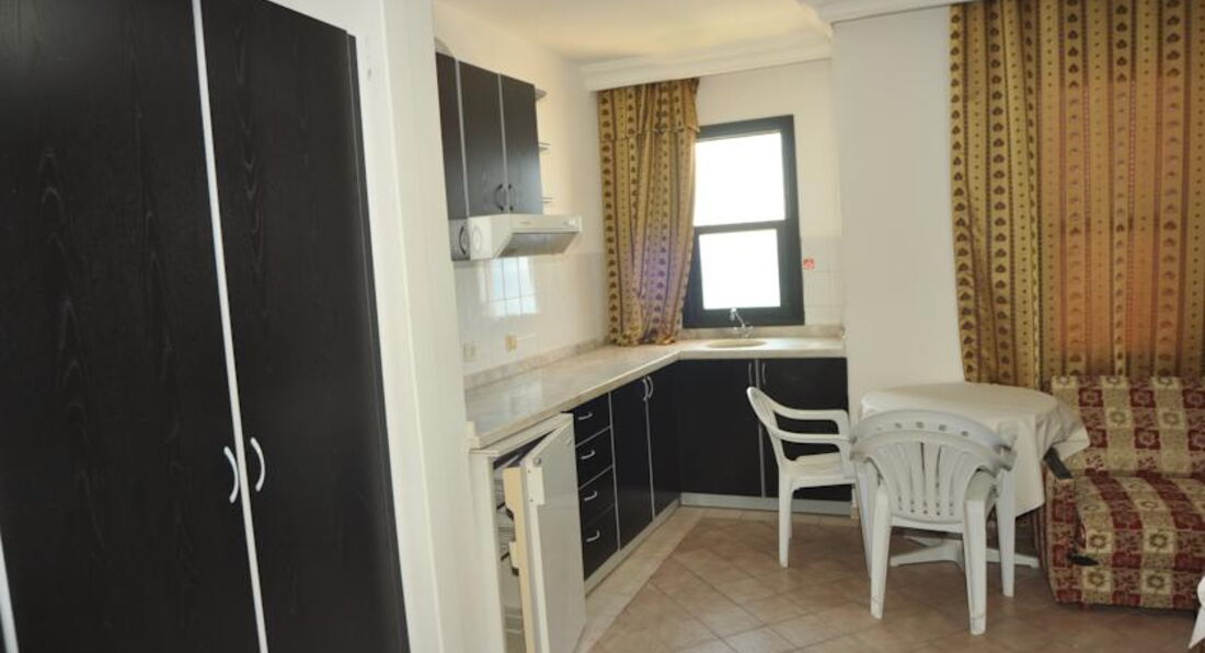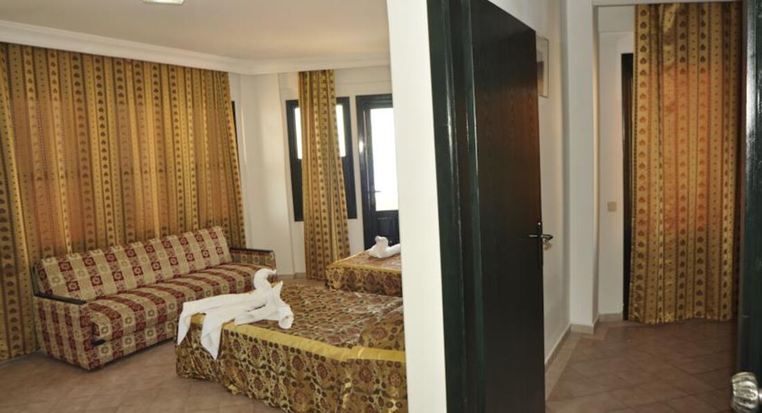 Вокруг строящие высотные здания - вид с шезлонга у бассейна, очень грязные столы, на полу лежали окурки, бегают кошки по столам, в холле запах затхлости от влажных кресел, общественный туалет-страшно заходить. Заселили нас сразу, что очень порадовало. Номер оказался двухкомнатным с двумя балконами, для семьи из 4-5 человек очень удобно. В номере диван, две полуторные кровати, и одна двухспальная кровать - постель белоснежная, полотенца застиранные. Есть даже кухонный гарнитур с вытяжкой, раковиной, но без плиты, холодильник. У отеля 2 здания, в первом более старый номерной фонд, поэтому был запах затхлости, старины, номер обшарпанный, в душевой реально одна шторка и та грязная, унитаз пах сильной канализацией. Вид на море и трассу, ночью мало шум машин, так еще анимация не давала спать. Хватило нас на сутки, мы попросили заменить нам номер за доп плату.