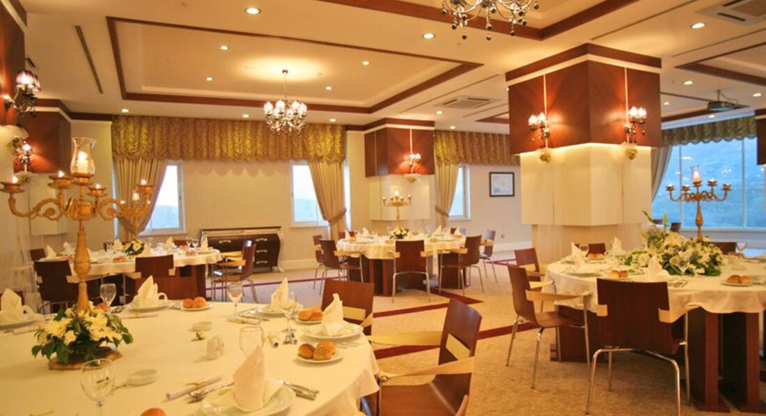 Бари та ресторани: головний ресторан розрахований на 700 осіб (критий, з кондиціонером, літня тераса, дитяче меню, дієтичне меню, дитячі стільці), лобі-бар (10:00-24:00), бар на пляжі (10:00- 18:00), бар біля басейну (10:00-18:00), SPA-вітамін-бар (10:00-19:00, платно), Zodiak-бар (18:00-24:00), диско- бар (24:00-02:00, платно), Gold Mey (12:00-24:00). 4 ресторани A la Carte: міжнародний, японський, турецька - платно, за попередньою резервацією; міжнародний – відвідування безкоштовно 1 раз на тиждень, за попередньою резервацією.