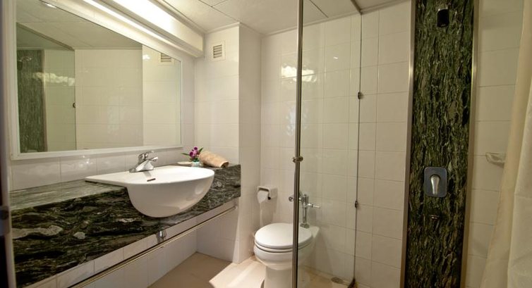 Номер достаточно просторный, мебель старенькая, но необходимый минимум ее присутствовал: в коридоре шкаф (если можно так назвать, он открытый, с несколькими вешалками), столик и два кресла, кровать и тумбочки, туалетный стол с зеркалом. Тумба с телевизиров (плазма). Сантехника была вся рабочая, некритические потеки были в ванной (ржавые). Плесени нигде не было. Ее не наполняли, только душ. В номере есть балкон, для меня это плюс (есть где покурить, кто курит и посушить вещи). Сейфа в номере у нас не было (они на ресепшн), дверные замки хлипкие. Ключ выдается один на двоих, можно оставлять на ресепшн. Вещи (особо ценные, те что, не вошли в сейф), хранили в чемодане под замком. Слышимость очень сильная между номерами.