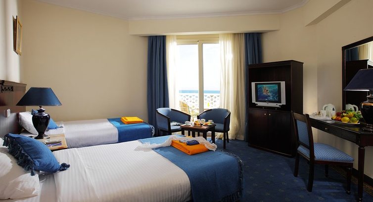 После прибытия в отель, нам одели браслеты и отправили в ресторан. Нам сначала быстрее хотелось получить комнату, но работники работники ресепшен переживали, что мы не успеем на обед. Тогда же мы познакомились с менеджером, который представился как Хассан. Он очень обрадовался, что мы говорим на английском и пообещал, что наш номер нам обязательно понравится. Пообедав, мы вернулись к ресепшен и получили ключ от номера. В номер нас любезно провел швейцар. Сам номер нам очень понравился. Начитавшись не очень хороших отзывов, мы ожидали худшего. Возможно, нам повезло, так как номер был с видом на море, в середине было все необходимое, все красиво и чистенько.