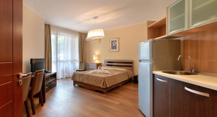 Только что вернулись из этого отеля. В Болгарию мы приехали впервые, воспользовались турфирмой Нева. По приезду в отель нас сразу заселили в номер. Так как сейчас конец сезона, отель практически пуст и мы попросили двухкомнатный номер. Персонал охотно пошли нам на встречу и предоставили просто замечательный номер с одной спальней и видом на море совершенно бесплатно (хотя мы оплатили только студию)))) Номер очень чистый, гостинная студия совмещена с кухней, в спальне шкаф и большая кровать. С зала и с комнаты можно выйти на балкон оборудованный столиком и стульями (мы на балконе обедали и наслаждались видом моря). В номере есть холодильник, плита и вытяжка. Если готовите в номере обязательно включите вытяжку, иначе может сработать пожарная сигнализация и к вам придет представитель отеля.))) Уборку в номере производили каждый день. Не могу сказать как часто меняли постель и полотенца, скорее по мере загрязнения. (мы не почувствовали, что у нас испачкалось и горничная не сменила.) В номере 2 кондиционера (В спальне и зале). Персонал отеля обходительны, вежливы, готовы решить любую нашу проблему. На территории есть салон красоты, спа центр, детские площадки. Бассей большой, чистый, лежаки новые в отличном состоянии. Питание тоже порадовало. Мы брали только завтраки. Еды много, меню практически всегда одинаково (в отелях как правило завтраки всегда однообразны). На завтрак овощи, колбасы, сыры, брынза, глазунья, яйца, ВОСХИТИТЕЛЬНЫЕ блинчики, ну и стандартно джемы, хлопья, нутелла, кола, кофе, чай. Все вкусно, все свежее.