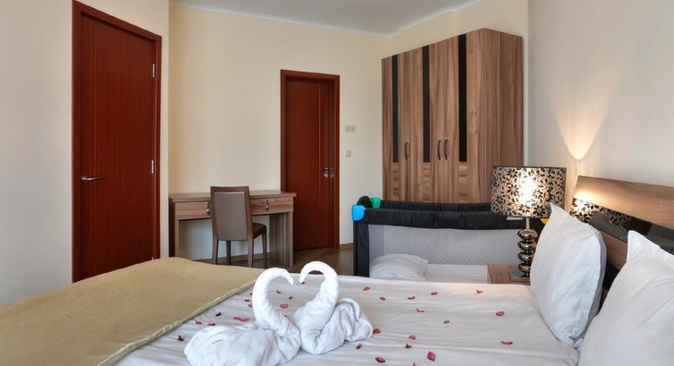 Была в отеле во время рекламного тура. Отель находится в тихом, спокойном месте, в то же время близко к центру и до пляжа всего метров 50. Номера просторные, новые, чистые, большие. В семейных двухспальневых номерах есть кухонный уголок с посудой, удобно для семей с детками или людей с аллергией на определенные виды продуктов, так как можно готовить самим. Приятно, что есть бесплатный вай фай. Есть детская площадка. Персонал знает русский язык.