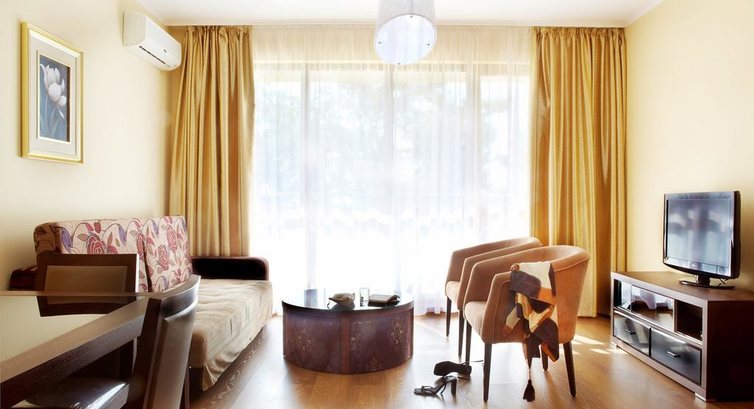 Номер.У нас был номер 117. Это первый этаж, но фактически из-за особенностей ландшафта второй (находится на уровне reception). Выходил окнами на стоянку, но это не мешало. Это был своеобразный "телевизор" для детей. Очень много событий с точки зрения детей там происходило. Какого-то лишнего шума соседство со стоянкой не давало. Номер просторный с высокими потолками. Как раз для семьи с 2 активными мальчиками-дошкольниками. В большой комнате шкаф-купе с зеркальными дверьми, небольшая кухня с плитой, холодильником, с набором посуды и чайником. Обеденный стол с пятью стульями. Диван и пара кресел. Конечно, телевизионный столик и телевизор с каким-то немыслимым числом тв каналов и радиостанции. В основном - болгарские, но есть и русскоязычные каналы (Россия24, Трэвел, Первый канал и так далее).
