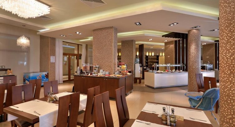 Ресторан расположен на этаже ресепшена, при входе отмечают номер комнаты. Выбор блюд более скромен, по-сравнению с Турцией, но вполне достаточен, вот только завтраки за 2-е недели несколько надоели (есть несколько видов мюсли, холодное и горячее молоко, соки из автомата, кофе есть из автомата и в кофейнике, омлет, яйца жареные/ вареные, жареные помидоры, несколько видов сосисок, жареная колбаса, каши ужасны – овсянка на молоке и гречка – никому не нравились, блинчики, несколько видов сладких соусов к ним, несколько видов сыров, колбас, свежие овощи, несколько видов маслин, маринованная рыбка, соленые огурцы, консервированная кукуруза, репчатый и зеленый лук, мороженное - на обед, полдник и ужин, вино можно наливать самим из бочонка, пиво и крепкий алкоголь наливает бармен), когда перечисляешь ассортимент – вроде много, но по-факту ребенок ел на завтрак либо мюсли либо блинчики с шоколадным кремом, я – омлет или жареное яйцо, жарен.помидор, пару сосисок и свежие огурцы, сыр, кофе. Хлеб вкусный, много, а вот с маслом и майонезом – беда, масло – чистый маргарин, майонез по-вкусу жуткий, сын не стал его есть, я тоже).