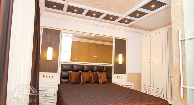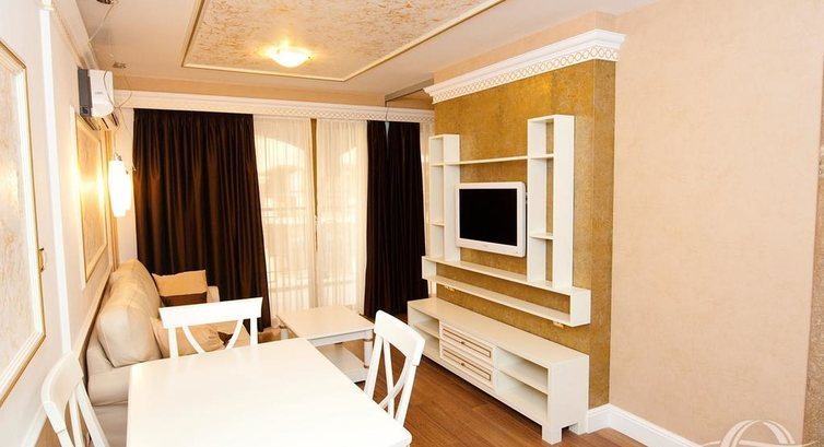 One Bedroom Apartment Lux Park / One Bedroom Apartment Lux Sea View – спальня з двоспальним ліжком і вітальня з розкладним диваном з суміжними дверима, зона кухні у вітальні з плитою, холодильником, електрочайником, посудом та приладами, макс. 2 дор. + 2 дит. або 3 дор., 46 м2;