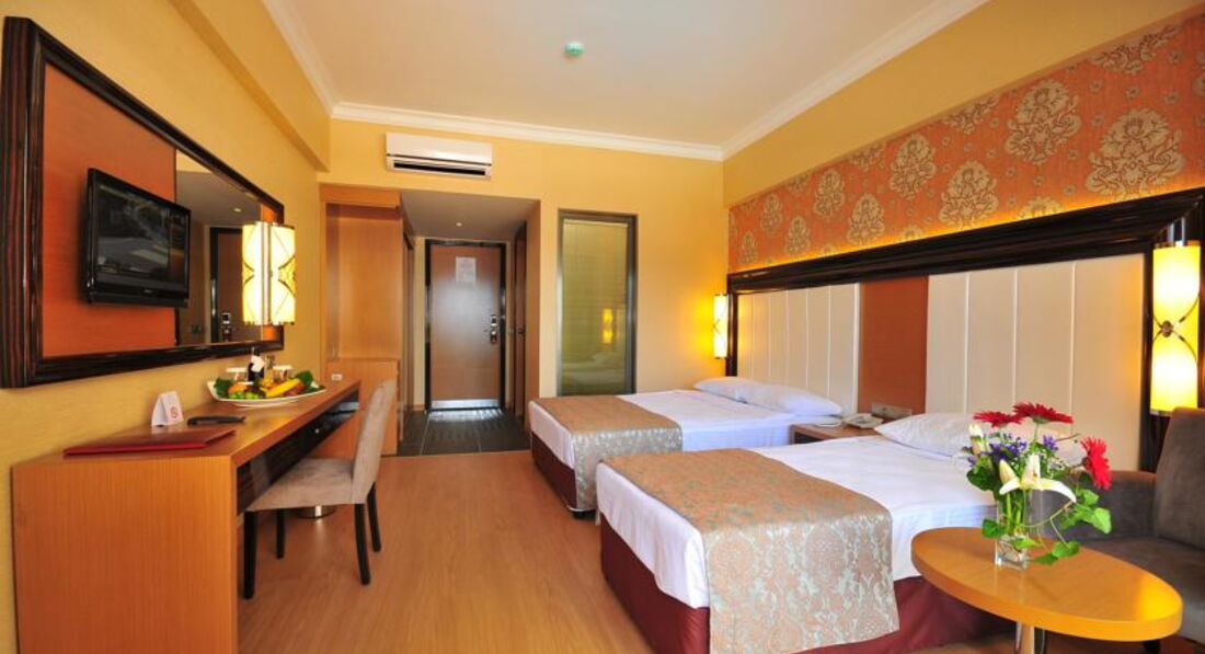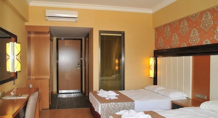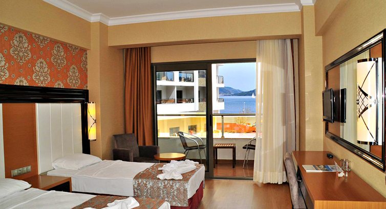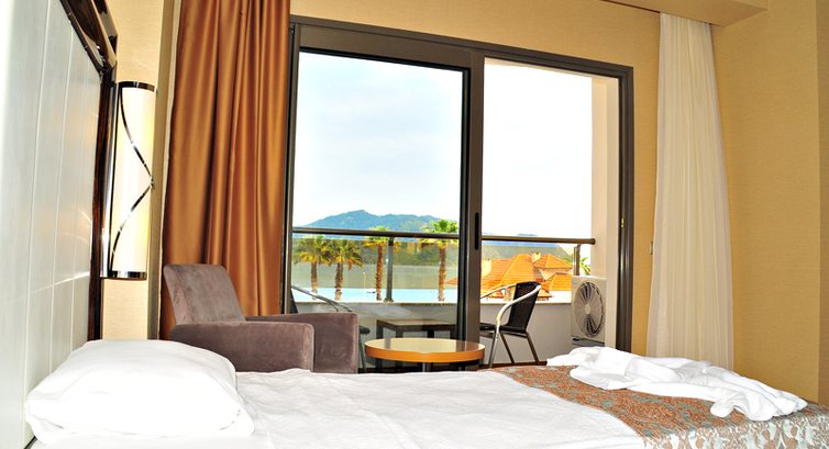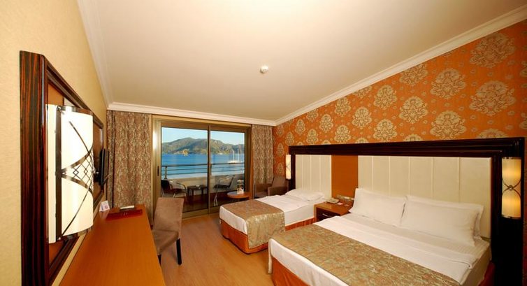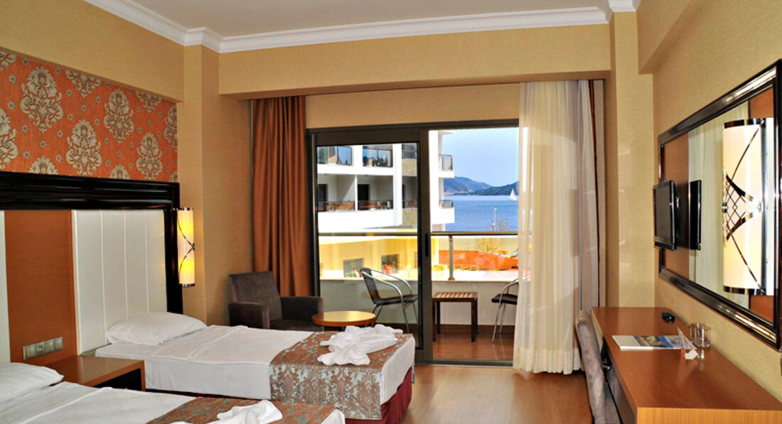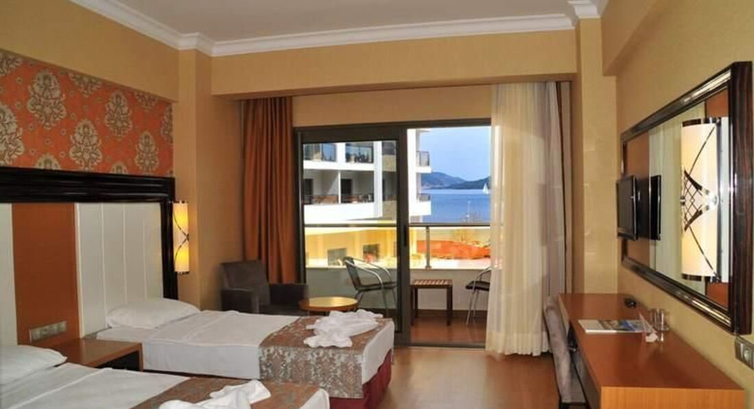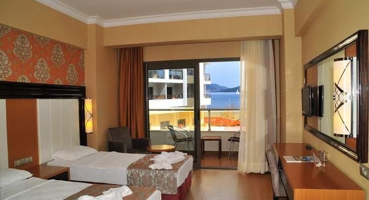 Отдыхали в этом отеле в августе 2013 г., ехали специально в новый отель и не прогадали. Отель сразу впечатлил своим современным дизайном (люстра в главном холле это нечто) и чистотой. На ресепшене встретила милая девушка, которая говорит исключительно на английском (как выяснилось остальной персонал тоже), но мне это было только в радость, ведь сразу можно сделать вывод, что отдыхают в основном европейцы, да и английским владею на разговорном уровне. У нас номер был с видом на улицу и на мою просьбу дать номер с видом на море мне сообщили, что надо будет доплатить 100 дол., я отказался, но мне все равно предложили просмотреть оба номера для сравнения :) Номер с видом на море конечно впечатлил видом, но все же не 100 дол. за него платить. Предложил за 50 дол, но мне скинули максимум до 80 дол. Отказался и не пожалел, ведь из обычного номера вид тоже был на хвойные горы, а на улице особого шума не было (в Мармарисе вся жизнь кипит в центре). В номере вся медель новая, плазма, кондиционер и все работало. Интересно то, что в стене душевой кабины окно с жалюзями, которые можно открыть и весь процес будет виден с комнаты (для тех, кто едет в паре это будет интересным бонусом :))