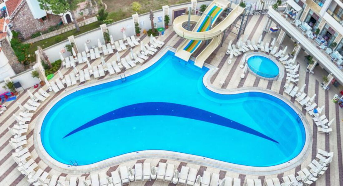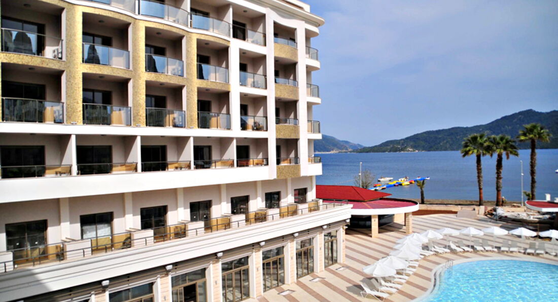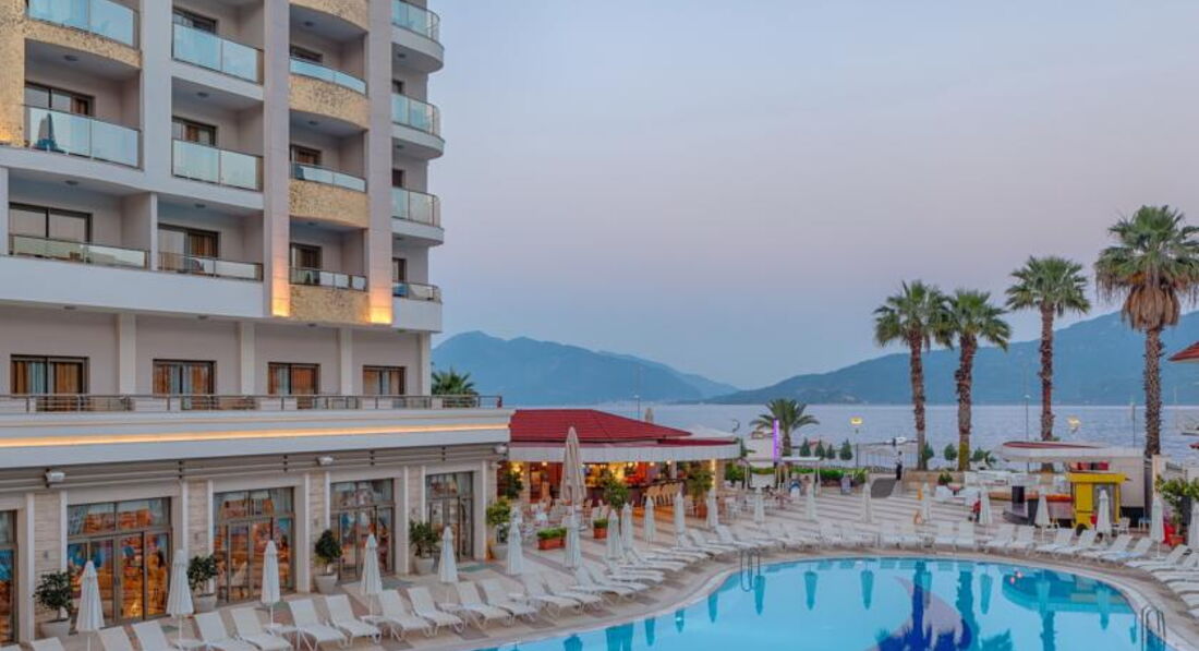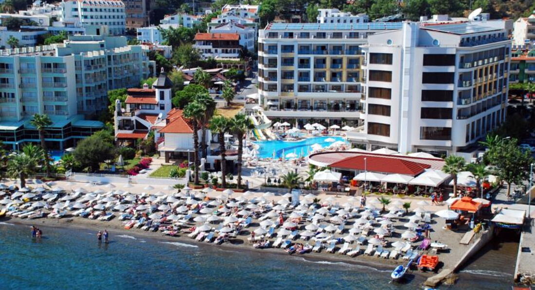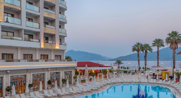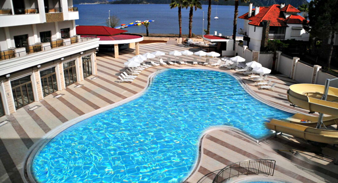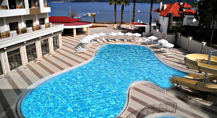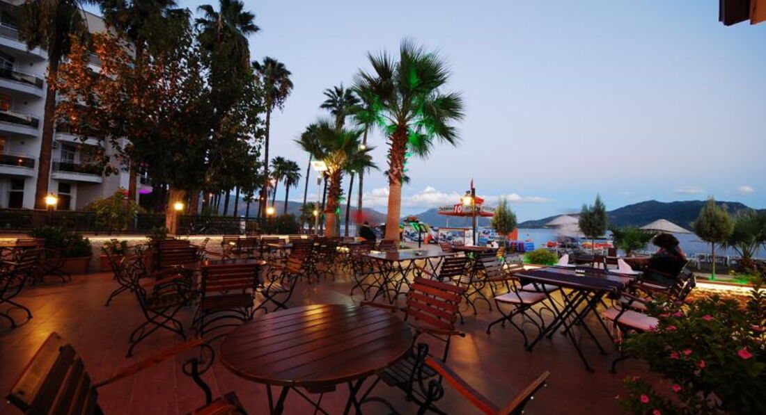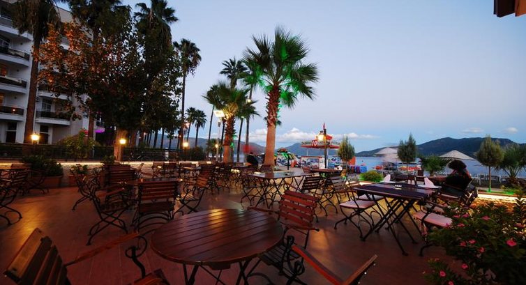 Добрый день! Отдыхали в данном отеле в конце июля начале августа. Путёвки приобретали в туристическом агентстве «Лечу, куда хочу». К покупке через них путёвок прибегали уже не раз, так как из всех предложений они дают самое выгодное. В аэропорту Даламан встретили представители «Интуриста», по дороге в Мармарис была совершена остановка для подкрепления и обмена денег. Сопровождающий гид подсказал, чтобы поменяли 50$ на мелкие расходы в первые дни пребывания. Для того, чтобы не путались курс доллара к лире 1 к 2, т.е 50$=100 турецких лир. До отеля с учётом остановок в других отелях добрались в течении 2-2,5 часов. Прибыли около 15:00, заселение прошло без заминок. Номер стандартный с боковым видом на море и бассейн. В номере всё новое, есть кондиционер мини-бар, в который каждый день ставили по 2 маленькой бутылке с водой бесплатно. Ванная комната просторная, есть гель для душа. Уборка в номере производилась своевременно и качественно. Питание было на высоком уровне, большой выбор блюд из мяса, птицы, всегда был хоть один вид рыбы. Многообразие салатов и овощей, а так же выпечки. Алкогольные напитки не вызвали никакого восторга, но мы были к этому готовы)))). В отеле отдыхает очень много иностранцев : англичане, немцы, голландцы, французы и турки. Наших соотечественников не так много, но наверное зависит от заезда. Атмосфера дружелюбная, никакого негативного отношения к русским со стороны обслуживающего персонала и других отдыхающих не было. Пляж, мелкая галька днём нагревается так сильно, что приходится бежать, чтобы не обжечься)). Вход в море хороший, вода прозрачная. Анимация в отеле есть, но ввиду того, что отель небольшой она не сильная, как например в больших отелях. Так для того, чтобы скучно не было. Отдыхали вдвоём, поэтому про детскую анимацию сказать ничего не могу. Приобретали экскурсии у отельного гида : Памукале и остров Клеопатры. Особо не вникал в их стоимость, поэтому приобретал у него. Хотя, если выйти на улицу, то можно найти много экскурсионных бюро наверное с более выгодными ценами. Из отеля по вечерам в 23:00 с аниматорами курсирует автобус на бар-стрит, там где много дискотек. Обратно возвращаются около 2:30, но вы можете уехать раньше или позже самостоятельно, их главная задача вас туда привезти, а там как вы дальше будете отдыхать ваши проблемы))) До 2 ночи по городу ходят Долмуши это зелёные автобусы, проезд в них стоит 2 турецкие лиры. Очень удобный транспорт для поездок по городу, когда захотите поехать за сувенирами или ещё чем-нибудь. Если хотите посетить магазин типа нашего большого гипермаркета, то садитесь на долмуш и езжайте до оранжево-белого здания с названием Migros, кстати аквапарк находится за ним на горе, так что экскурсии не берите, больше сэкономите. Вечером для разнообразия можно посетить кафе напротив отеля, цены приемлемые. Можно совершить прогулку по променаду вдоль моря. В заключении хочу сказать, что отель очень хороший, персонал приветливый и отзывчивый. Кто рассматривает его для отдыха советую посетить. Но у всех разные вкусы, поэтому этот отзыв лишь моё личное мнение, а у каждого оно своё.