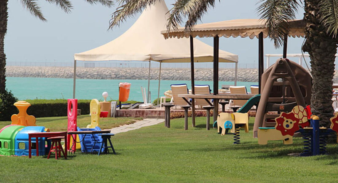 Отель нахоится на полпути между Дубаем и Абу-Даби, поэтому за территорию выйти некуда. Но территория самого отеля большая. Основной корпус располагается на берегу неширокого канала. Желающим поплавать на просторе придется либо брать размещение в бунгало, либо ездить на пляж на бесплатном автобусе.