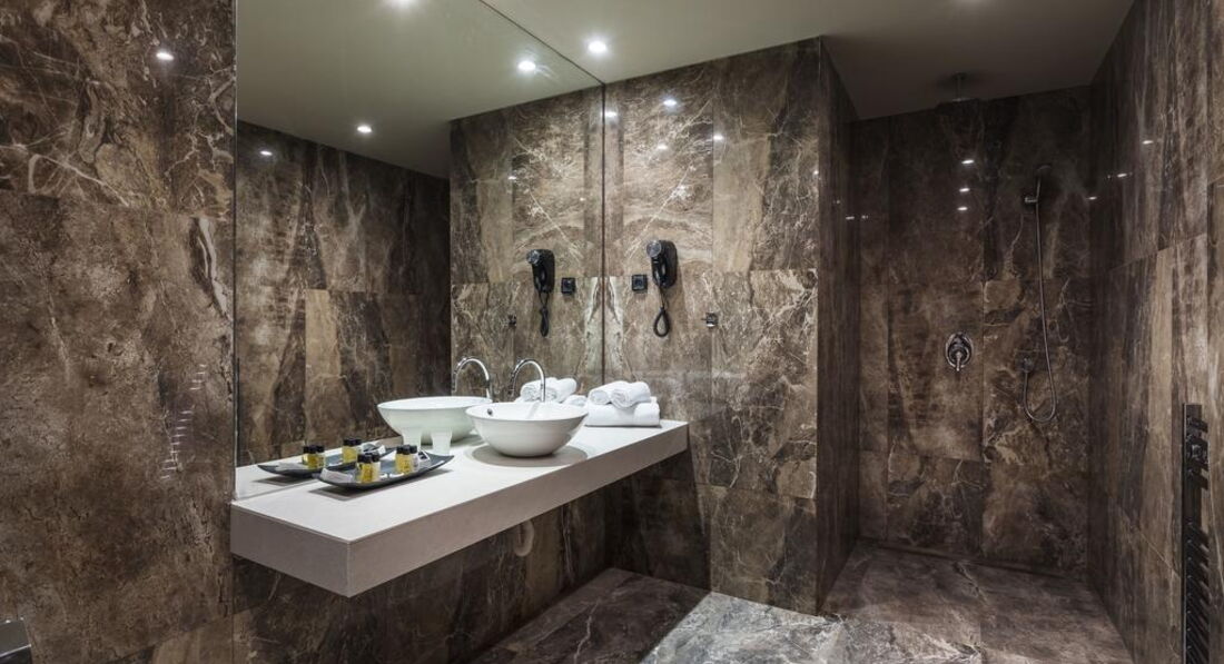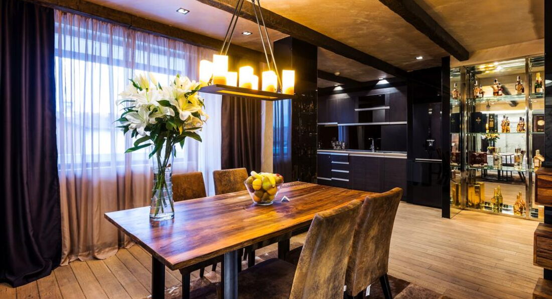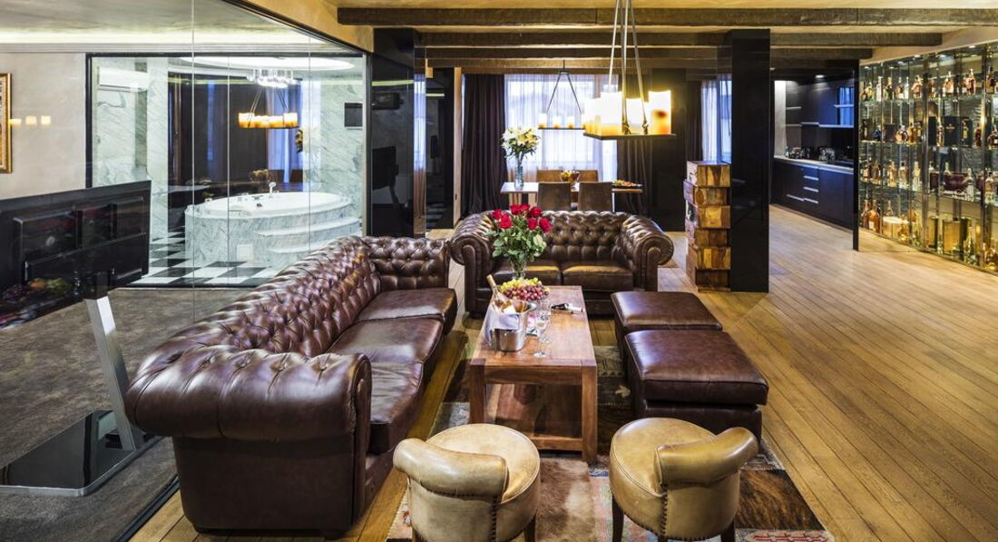 • Презитентський апартамент розташований на верхньому поверсі і має чудовий краєвид на гори, з ліжком King Size та каміном. Номер складається зі спальні та великої відкритої кімнати, де вітальня та зона відпочинку розділені панорамним склом, шикарною ванною кімнатою з джакузі. Максимальне розміщення 2+0 (200 кв.м)