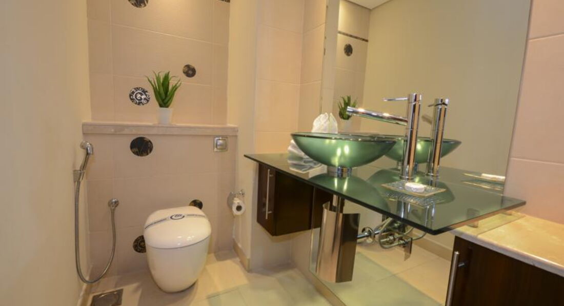 - Номер просторный. Мебель в хорошем состоянии. Есть необходимый минимальный набор посуды, а также микроволновая печь, плита, холодильник и СТИРАЛЬНАЯ машина, что меня крайне порадовало. В туалете есть биде (хотя чего этому удивляться, в Дубае даже в общественном туалете они есть). А еще там есть телефон. Короче все удовольствия, так сказать, в одном месте.