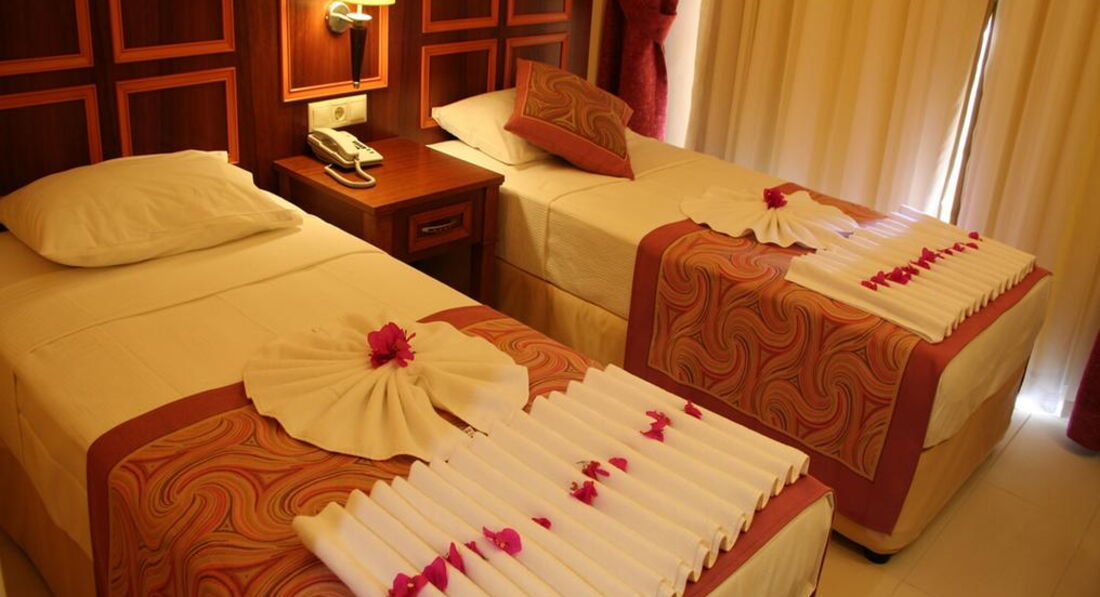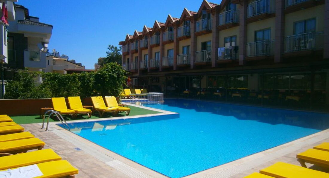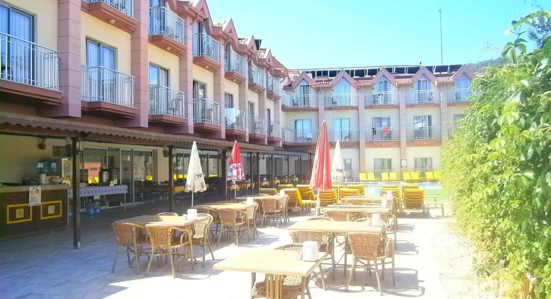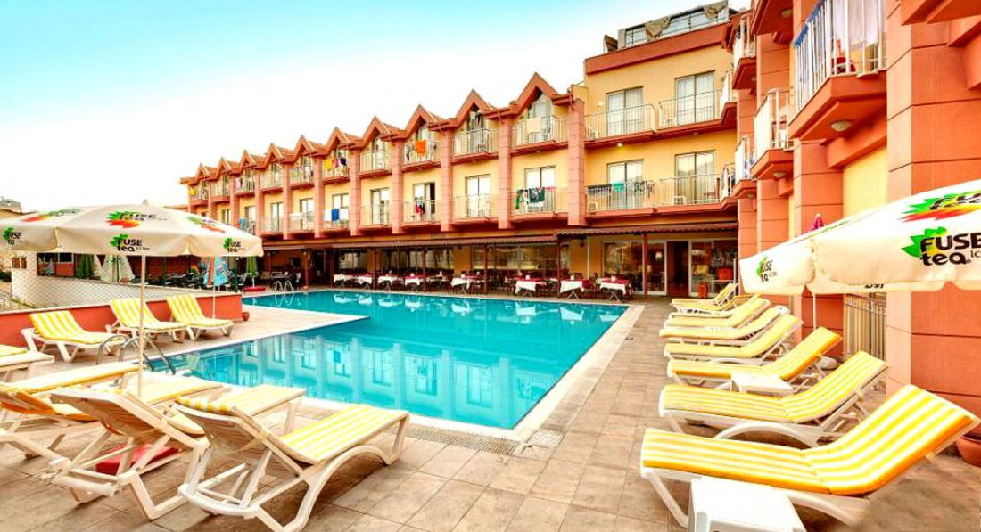 Только вернулись. Отдыхали неделю с 11 по 18 июня. Уютный отель. Номер чистый. Все работает. Фен, кондиционер, сантехника, маленький холодильник. Телевизор не включали. Не большой балкончик. На поручнях удобно сушить полотенца и купальники:). На территории отеля бассейн. Ежедневная чистка. Рядом шезлонги с матрасиками. Питание. Если нет цели обжираться:), то все устроит. Приготовлено все вкусно. Очень понравились десертики. Предпочитаю вино, его и пили. Нормальное качество. Персонал отеля работает очень оперативно. Сервис выше похвал. В первый же день, после перелета, пошли в хамам отполировать свою кожицу для загара:). Услуга предоставляется и отелем, чем мы воспользовались. И хорошо, что Али (массажист) предложил выбрать процедуру пилинга с лечебным массажем. Смогла сразу оценить, что качественно прорабатывает мышцы и техника схожа с body massage, который я делала во Вьетнаме. И то, хороший массажный салон, там, нашли не сразу. А тут тебе раз, пожалуйста. Каждая из нас успела сделать целый недельный курс. По питерским меркам цена сеанса очень приемлема. Да, и дома, заняться собой, все некогда:), несмотря на сидячую работу. Отель находиться на 3-й линии. Нам было лениво ходить пешком, поэтому ездили на отельном автобусе. Поездка до пляжа занимает минуты 3. Расписание соблюдается минута в минуту. Ну вот такой расслабленный отдых себе устроили. Пляж чистый, шезлонги с матрасами. Есть душ с пресной водой, туалет, раздевалка, все, как и положено. Анимация. Был вечер с живой музыкой, другой с конкурсами, ежедневно мини-дискотеки для детей и просто дискотеки. Когда вечер проводили в отеле, не выбираясь. Съездили с аниматорами и в ночной клуб. Адекватно могу оценить, что соотношение цена-качество у отеля, великолепное. По поводу экскурсий. По наводке своих отельных соседей сразу пошли в турагентство Oflgaze (там менеджер Кемаль). Оно находится прямо через дорогу остановки на пляж отельного автобуса. Время для отдыха у нас было мало, поэтому взяли только круиз на пиратской яхте. Понравилось. Забрали от отеля, покормили, раза 3-4 поплавали в открытом море, посмотрели шоу-программу, отвезли в отель. Отзывы об организации экскурсий были хорошие, цены замечательные, по сравнению с туроператорами. Так все говорят. А при завышенных туроператорских ценах, кто у них вообще покупает экскурсии? Хорошо отдохнули. Чего, всем и желаю.
