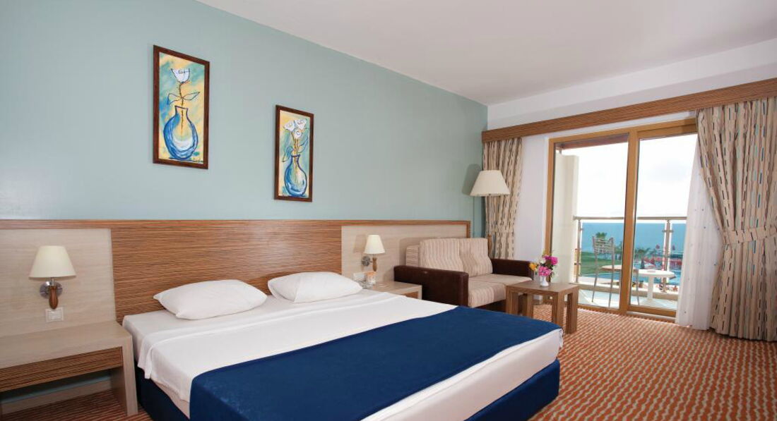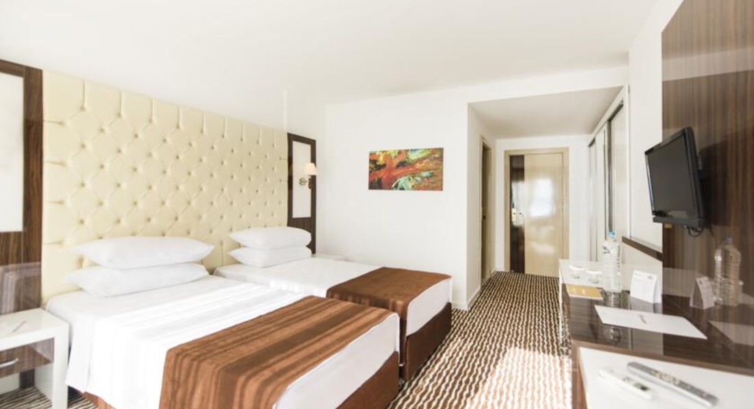 1. Приехали в 8.10 по турецкому времени, заселили в 15.00. Сперва дали номер, который я назвал "чулан для одинокого алкаша забулдыги". Я, жена и сын 10 лет, в номере одна большая кровать, от которой по 70 см до стен, вместо окна 4 стёклышка на входной двери. Предложили за 480 $ номер Фэмили, в итоге после скандала мы заехали в Фэмили за 200 $, 3 этаж, вид на море, две комнаты, два санузла. Как позже узнали от европейцев, номера в основном корпусе стоили на 50 т.р. дороже номеров в Клабах. Вообще расселение это что-то невообразимое, в наш дальний корпус клаб поселили семью с женщиной инвалидом, которую возили на кресле-каталке... Правильнее было бы заселить их в основной корпус.