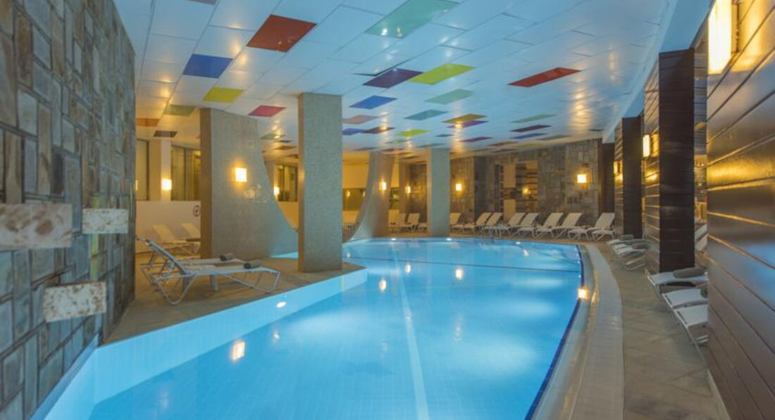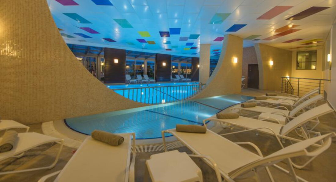 Бассейны: их 3 штуки. Главный в центре между "крыльями" основного здания. Релакс-бассейн (на котором висит объявление на всех языках , что дети до 16 туда не допускаются -это фигня, там тоже масса детей с кругами-крокодилами визгом-писком), бассейн с горками справа от амфитеатра. Есть ещё крытый бассейн, но там тоже дети! Горки включают днём часа на 2-3. Лежаков у бассейнов много, но история та же, что и с лежаками на пляже.