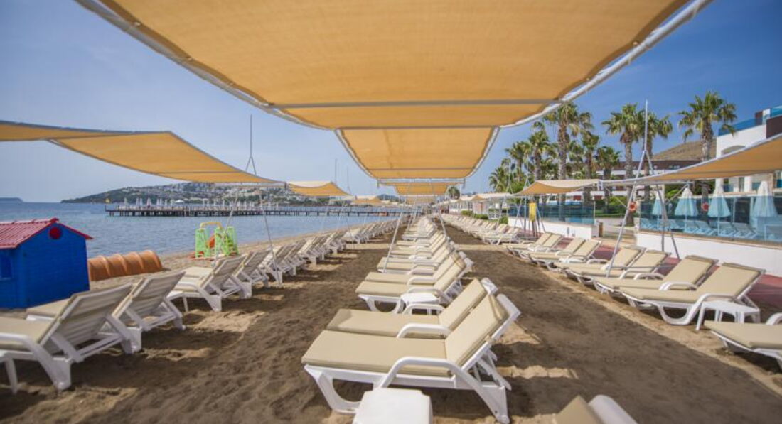 Пляж: власний, піщаний, довжина 300 м, душ; пляжні рушники на пляжі та біля басейну - депозит; парасольки, матраци на пляжі та біля басейну - безкоштовно.