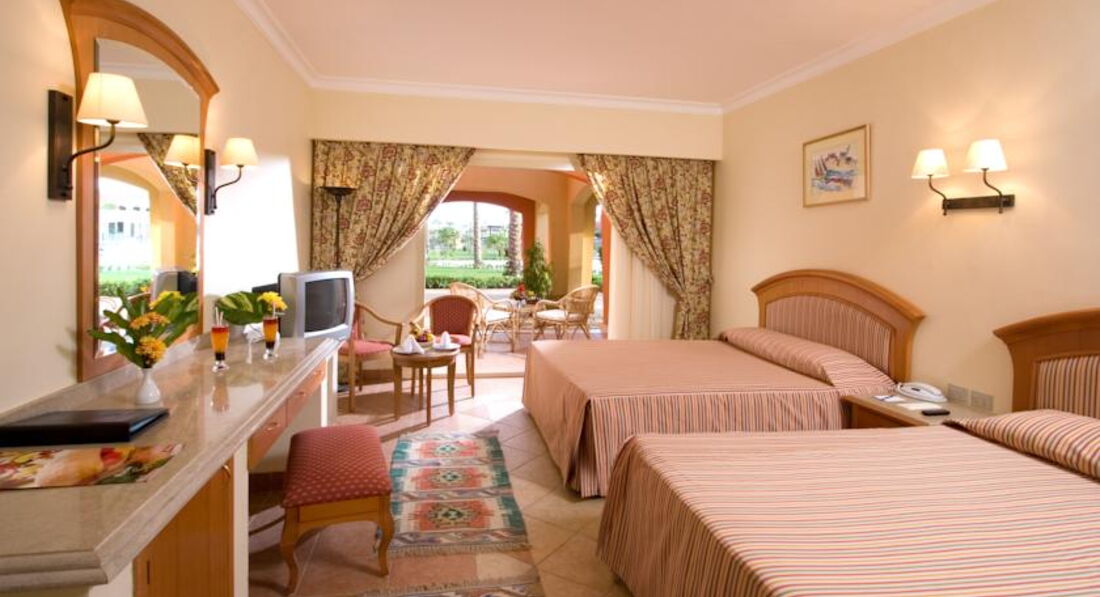 Номер нам дали возле здания ресепшена, опять же от моря далековато. Номер нормальный, условно чистый, то есть как и принято в Египте, внешне прибрано. Порадовали кровати. Одна огромная двуспальная, вторая полуторная. Сын был в восторге. В санузле тоже все было в порядке. А вот потом с уборкой нам не повезло. Не знаю, можно ли сказать, что это политика отеля, или же это лень именно нашего уборщика, но убирались у нас очень плохо. Уборка заключалась только в застилании кровати и развешивании полотенец. Самое неприятное даже не то, что мы приносили на обуви песок, который практически весь отдых хрустел под ногами, а то, что брошенные на пол полотенца поднимали и складывали на полочку. После нашей жалобы на ресепшене, убрались один раз – подмели песок, поменяли полотенца, на этом уборка закончилась. Оставили чаевые один раз в самом начале, но потом видя качество уборки, перестали оставлять.