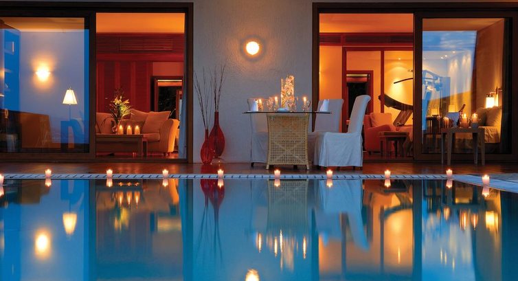Sunset suite with private pool (розташовані на березі моря, спальня та вітальня відкритого плану, осн. ліжко – двоспальне, парова з душем, ванна з аеромасажем, фітнес-зона, масажний стіл, індивідуальний басейн з гідромасажем та протитечією, макс. 2 чол. , 88 м2),