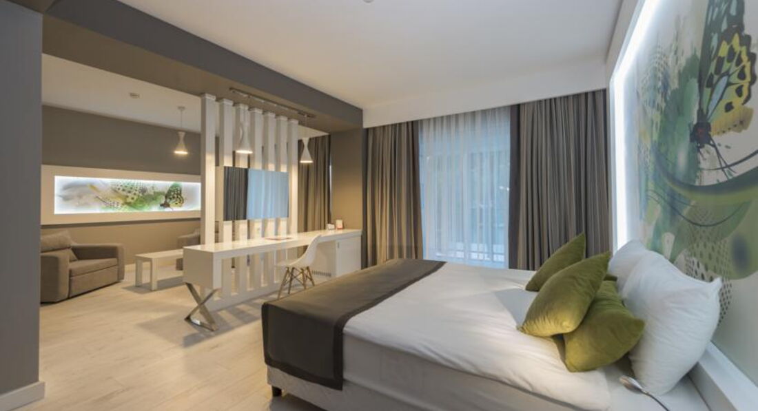 Впервые с мамой побывали в Турции! И поэтому сравнить не с чем, делюсь первым впечатлением от страны и отеля. Самый приятный бонус это близость отеля к аэропорту, дорога занимает около часа. Заселение проходило поздно вечером, может в следствие этого, администратор на ресепшене был не слишком любезен, но было сказано: "Я дам вам очень хороший номер". поднимаемся на 5 этаж, заходим в номер и немножко шокируемся)) Сразу оговорка, что мы очень не притязательны к таким вещам, приехали за морем, природой и солнцем..Так вот, в номере все чисто, это плюс, далее о минусах) Комната, похожа на мансарду, со скошенным потолком, очень маленькая, с застиранными шторами и и покрывалами. Но, постельное белье чистейшее, хрустящее и спалось в итоге замечательно)) Новые сюрпризы с утра, это вид на соседний отель, а точнее опа..стройка) Шум трассы с одной стороны, шум городской дороги с другой..Это реально очень портит впечатление, так как мы выбирали уединенный отдых, вдали от городского шума..Если абстрагироваться от этого, вдали видны живописные пейзажи это горы и кусочек моря..Могу успокоить тех кто приедет в отель в середине лета, стройка подходит к концу и возможно вид будет гораздо интереснее) В общем на второй день мы привыкли и перестали париться, так как в номере мы только спали. Нас с с мамой очень порадовала еда, обслуживание в столовой, сама кухня, все было очень вкусно, приготовлено с душой, мы были всегда сыты..еда на любой вкус. Это тоже один из больших плюсов отеля. Спасибо сотрудникам столовой отеля, они делаю работу на совесть. Про пляж..очень не плохой чистейший пляж, никаких нареканий, галька не слишком крупная, вода прозрачная, переход на пляж очень удобный. Еще хочется выделить анимацию, ребята очень позитивные, старательные, доброжелательные. Бары все замечательные, мальчики на барах всегда улыбчивые, правда не всегда понимаю чего от них хотят)) Надо объяснять на пальцах. Классные дневные тренировочки с Юлей (светленькой) по аквааэробике, вечерние с Юлей (темненькой) по бэли-дэнс и зумбе) А также стэп-аэробика это бомба (Юля светленькая)! Благодаря им все наеденные калории легко сжигались и хорошее настроение было обеспечено! Вечерние шоу мега-позитивные, мама посещала все) Очень понравился концерт турецкого танца в наш последний день перед отъездом. Дополнительно отмечу территорию, много зеленой растительности и красивых цветов. Если обобщить то впечатления самые лучшие от общей атмосферы отеля. Рекомендую семьям с детками и любящим спокойный семейный позитивный отдых этот отель. Спасибо за внимание)