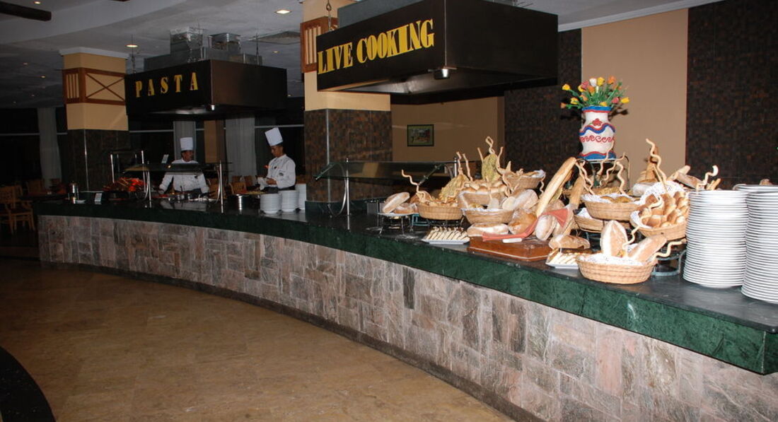 Питание неплохое. Поесть можно всегда. Из фруктов были апельсины, гранаты, виноград, дыня, бананы. Каждый третий день жарили мясо на гриле, то курицу то люля-кебаб. Рыба - непонятное филе в панировке и один раз горелый тунец. Официанты - хамло. Немцам в стекле напитки, у кого всё включено - пластик. На мою просьбу дать кружку с ручкой чтоб донести кипяток с чаем до столика кинул мне пакетик чая в стакан и сказал "так донесёшь".