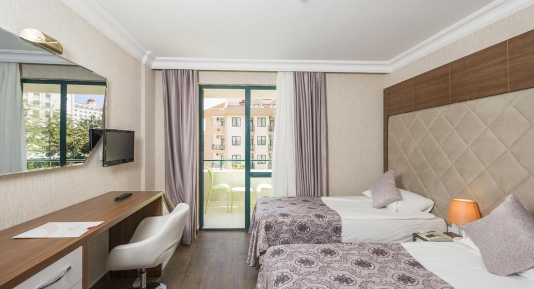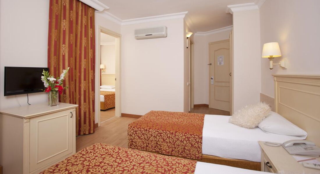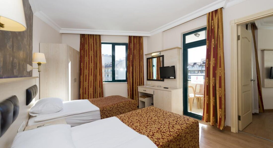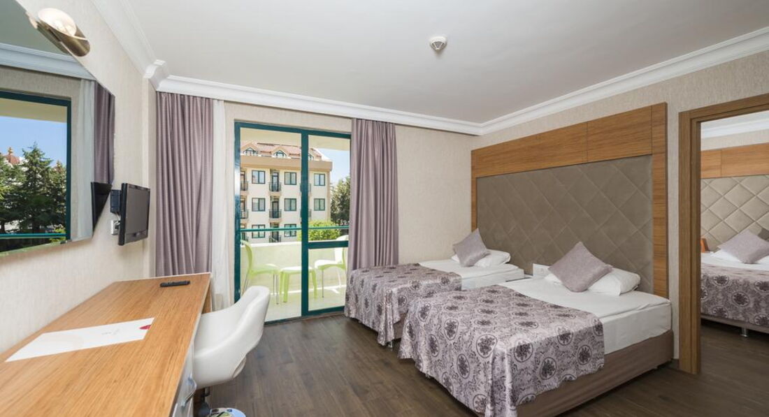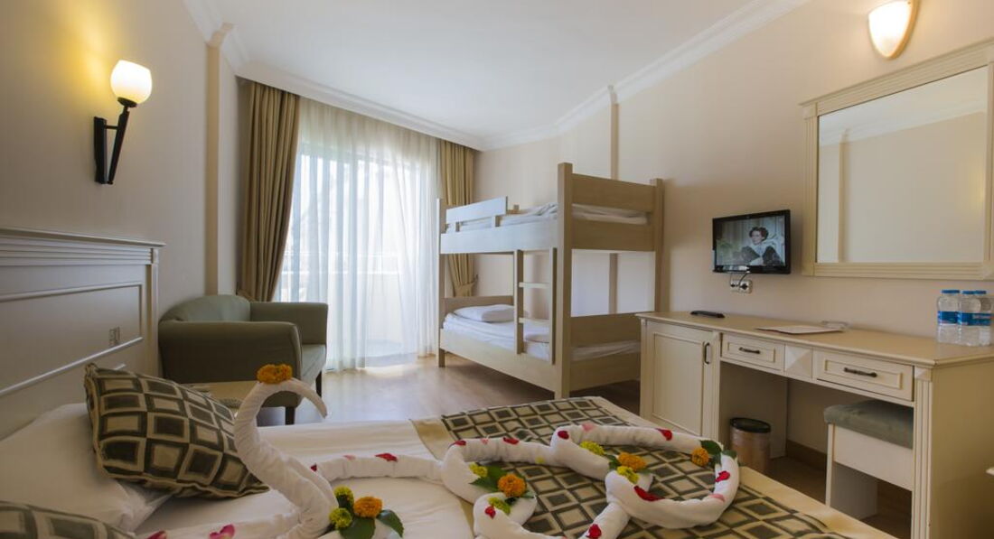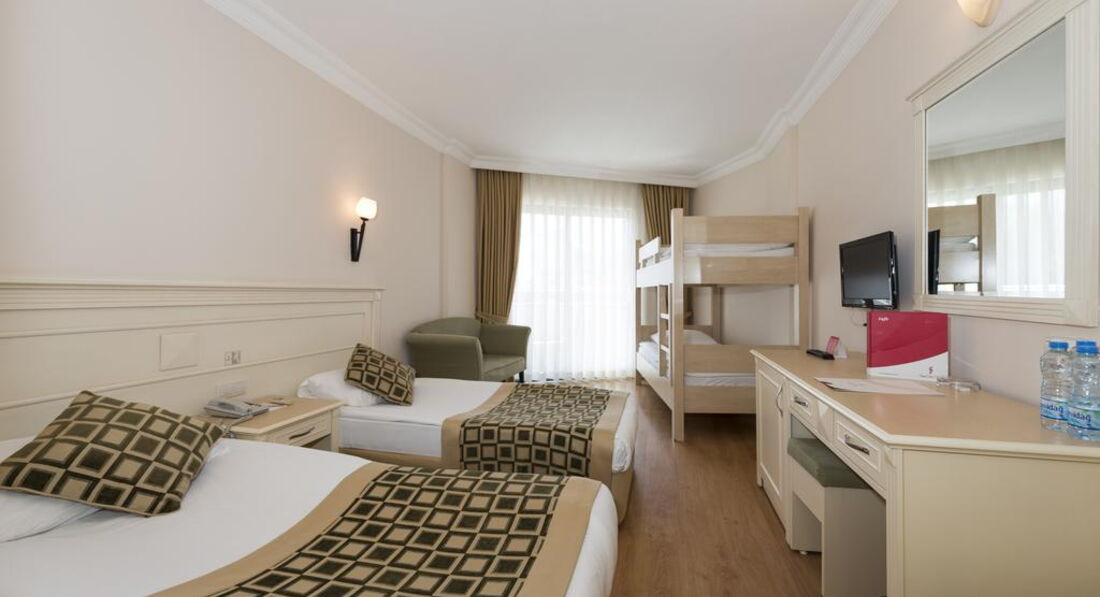 Всю историю разбирательств и переговоров с туорператором пересказывать не буду, итог был таков: да, в отеле действительно есть два типа фэмили рум, но у туроператора это на сайте указано не было. Указано было описание только двухкомнатного номера, которым я и руководствовалась при бронировании. Это все равно как ценник с неправильной ценой в магазине, когда подходишь на кассу, а тебе говорят: "ой, извините, тут неправильно написано, вы или берите товар похуже за эту цену, или платите в два раза дороже". В России в магазинах продавец обязан продать товар за ту цену, что была указана на ценнике. В Турции, пользуясь тем, что нам некуда деваться, нас просто заселили в однокомнатный номер и быстренько поменяли информацию на сайте, указав уже два различных типа "фэмили рум". Все это значительно отравило нам первые два-три дня пребывания в отеле из всего-то 9. И хотя это полностью и целиком вина "Анекс-тура" (который теперь у нас в черном списке туроператоров при выборе отдыха), отелю за размещение ставлю "3" по той причине, что изначально и администратор пытался нас заселить даже не в фэмили с двухъярусной кроватью (который все же попросторней эконома и стандарта), а в натуральный трехместный эконом. И при этом упирался, что у нас указан трехместный номер, и лишь услышав от меня, что я понимаю, что такое "bunk bed" , показал все-таки номер с двухъярусной кроватью.Вдобавок, с препаршивым видом на крышу рядом стоящего здания и окна напротив(