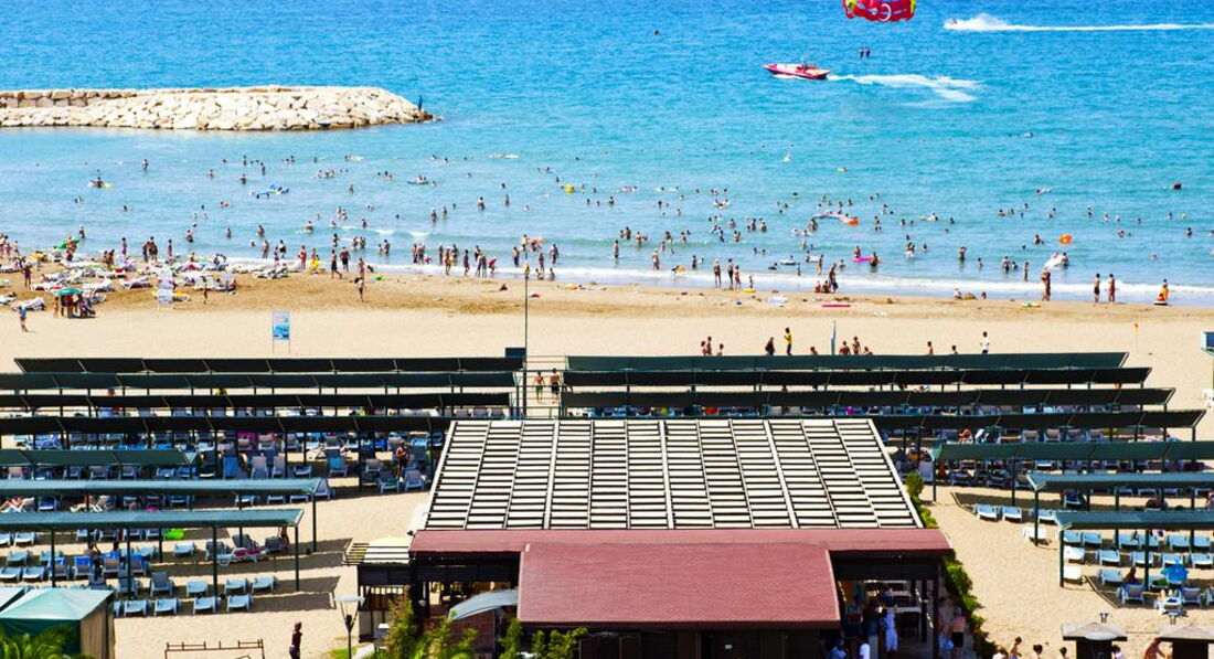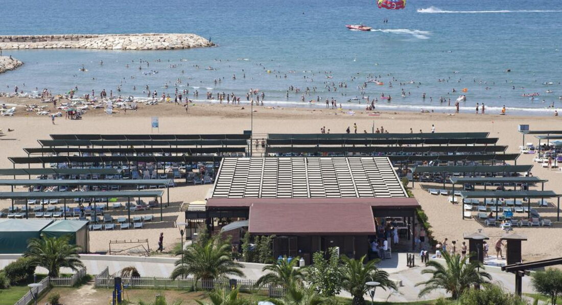 Пляж: широкая песчаная полоса, навесы для тех, кому нужна тень. Минус пляжа, что именно этот отель является крайним и слева идет слив с города, речка-слив в море,поэтому вода грязная,имеет неприятный запах, искусственно созданный залив собирает грязь с моря (ветки, водоросли), мы эту проблему решили тем, что просто уходили купаться правее за шалаш водных аттракционов.Там вода чистая и прозрачная)