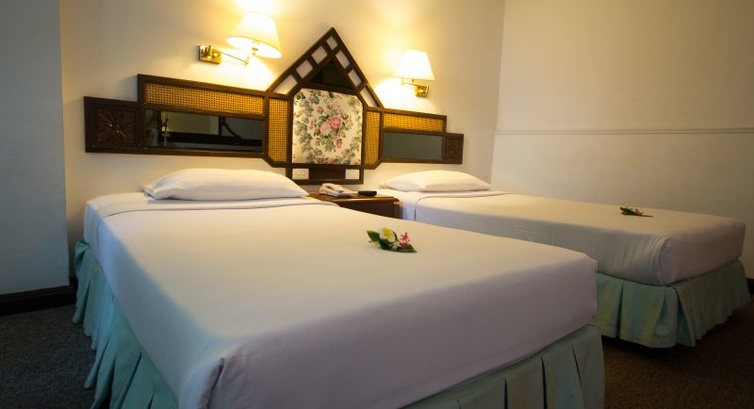 Заехали в отель около 10:00, разместили около 12:00, при заезде взяли депозит 50 долларов, при выезде вернули. Номер делюкс, в номере плоский телевизор, чайник, все для чая и кофе, фен, холодильник (пустой), стол рабочий, стол стеклянный со стульями, большая кровать, электронный сейф. Насекомых не видел, балконы только в супериорах и только до 2 этажа, балконы на этажах. Ковролин в номере видавший виды, постельное чистое, без пятен. Система кондиционирования, конечно, требует замены, в номерах кондиционеры старого образца, без пульта, в коридорах ковролин тоже жутковатый, на потолке в коридоре местами чёрная плесень, но это проблема всё - таки старой системы вентиляции. Хотя белье в номере за ночь высыхало. Да, и окна в номерах не открываются, завинчины на саморезы, видимо в целях безопасности, а может из-за поломок оконных механизмов. Питание на 3 + каждый день одно и тоже, но голодными никто не остался: яйца, омлет, сосиски, ветчина, супчик из курицы или рыбных шариков, два вида риса, макарошки, огурцы, помидоры, зелень, из фруктов - ананасы, папайя, арбуз. Есть ещё хлопья. Персонал отзывчивый, понимают по-английски. Рядом возле правого и левого 7/11 есть тайские камешки, там рис с курицей или свининой, лапша со свининой или курицей по 50 бат за порцию, очень адекватная цена. Напротив отеля камешки, рыба и ребрышки гриль, креветки по 100 за порцию. Рыбка в соли по 100. Фрукты здесь же, правда дороже процентов на 20... Жить можно. Отель соответствует своим 3 звёздам, многие турецкие 4 выглядят хуже... Если бы питание расширить, то, я думаю, отель был бы 3+...