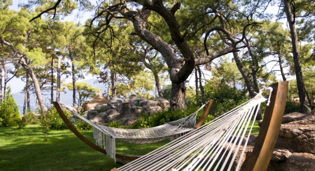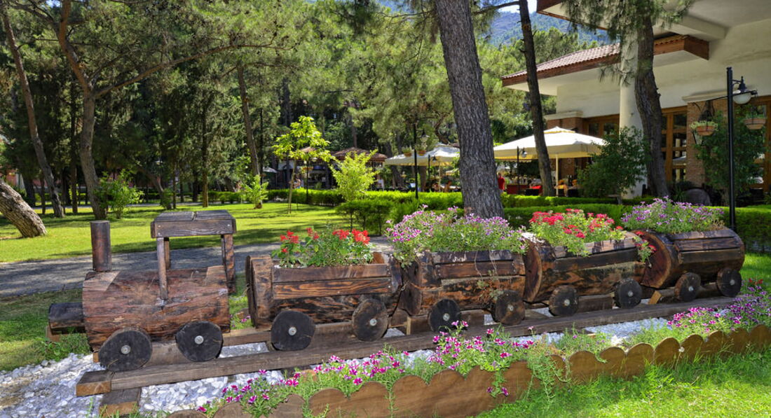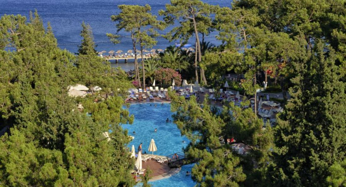 Отель расположен в прекрасном месте с хвойным лесом, под подножьем горы, сразу на берегу моря, территория отеля огромна, и мы на самом деле за неделю даже не везде побывали (в частности на горках, которые извиваются между соснами). Как я уже сказал, большая площадь отеля, на мой взгляд это очень большой плюс, так как большое количество гостей, которое одновременно проживает в отеле, равномерно "рассасывается" по территории, и недостатка мест в зонах отдыха (пляж, бары, рестораны, бассейны, лобби и т.д) вообще нет, как это часто бывает в маленьких забитых отелях. Все сервисы очень удачно расположены по территории, получается как бы замкнутый круг :), если идти из бунгало-номера с горки по центральной аллее то получается такой маршрут 1) Ресторан (покушали) 2) Лобби бар (попили) 3) Бар возле бассейна (попили опять) 4) Бассейн (получили полотенца - вскупнулись) 5) Пошли по аллее на пляж (вскупнулись) 6) Вышли из моря на берегу снова бар :) (попили) 7) Рядом с пляжем через променад налево закуски с утра до обеда, а направо сладости и мороженное детям, тут почти до вечера, в неограниченном количестве. Поели, попили покупались, дорога на обратный круг, можно зайти в SPA центр, потом по лестнице мимо большого амфитеатра примерно на 800 человек, возвращаемся в номер, и снова в ресторан :), а вообще конечно круги каждый себе наматывать будет по своему :) В этом плане отель замечательный есть где посидеть, полежать, поплавать, помедитировать.
